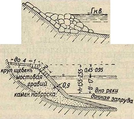 6. Типы регулирующих сооружений. Регулирующие сооружения м. 0. разделены: а) на неподвижные водостеспительные сооружения, б) на подвижные водостеенительные приспособления и в) на различного рода укрепления берегов и дна потока. К первому виду регулирующих сооружений относятся буны (смотрите), дамбы (смотрите), донные запруды (смотрите). Все эти сооружения строятся непосредственно в воде на основании. к-рое изменчиво само по себе или изменяется под влиянием произведенных работ; это обусловливает применение камня и фашин, то есть таких материалов, которые можно ссыпать или погружать. Более целесообразными в данном случае являются каменные сооружения, которые более прочпы, чем фашины; непрочность последних особенно сказывается в реках, несущих большое количество наносов. Ко второму виду регулирующих сооружений принадлежат все временные подвижные приспособления в виде погружаемых деревьев, различных подвесных приспособлений и подвижных заграждений (смотрите), преследующих цель отложения около них наносов. Третий вид регулирующих сооружений в виде разнообразных укрепительных приспособлений имеет назначением защитить берег (смотрите Берегоукрепительные работы) и дно реки от разрушительного действия потока. Все места новых отложений наносов, являющиеся результатом возведения новых водостеснительных сооружений, по достижении желаемой цели должен быть защищены соответствующими укреплениями. Большинство регулирующих