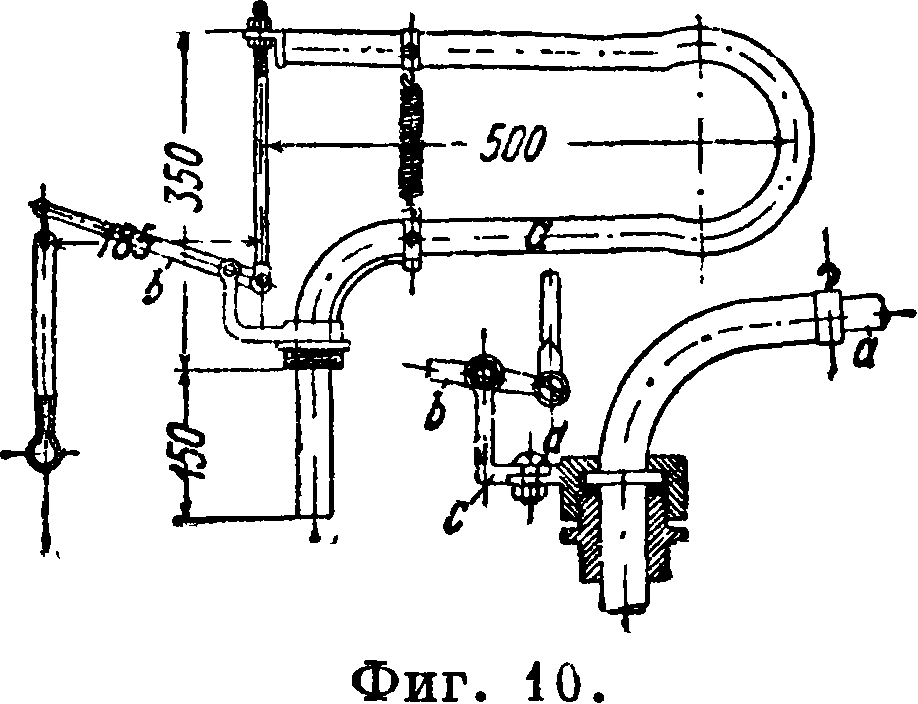 Р. тяги работают: а) на принципе расширения или сжатия воды при изменении ее t° и б) на принципе изменения давления пара. Передача колебаний на воздушный канал происходит у большинства конструкций Р. при посредстве рычага и цепи при передаче до 1:200 и более. Р. тяги, действующие при изменении г° воды, имеют металлическую расширительную трубу, передающую изменение своей длины на рычаги с большой передачей. На фигуре 8 показан Р. тяги, у к-ро-го подвижная (расширительная) труба а закре-плена в направляющей раме b. Движение трубы а передается на рычаг и далее посредством цепи на воздушный клапан. Фигура 9 изображает Р. тяги, расположенный между подъемным трубопроводом с и обратным трубопроводом; подвижная труба в этой установке помещена в гильзе, закрепленной в нижней своей части. В последних двух конструкциях теплая вода течет через прямую расширительную трубу. На фигуре 10 представлены два типа Р. тяги с изогнутыми расширительными трубами а, наполненными жидкостью, способствующей сближению или удалению противолежащих частей расширительной трубы с изменением г°. Этот“ прибор привинчивается своей неподвижной частью непосредственно на котел или заделывается в циркуляционный трубопровод. В другом исполнении плечо с регуляторного рычага b рас