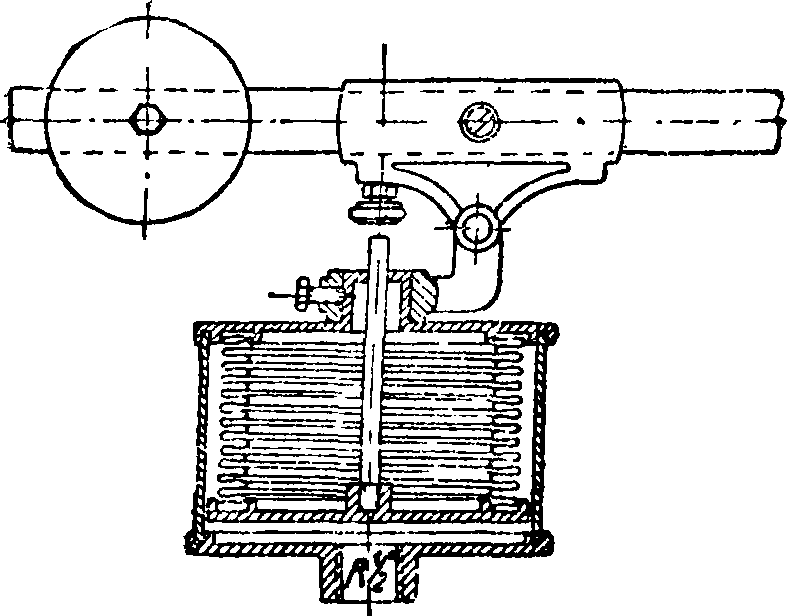 неизгибающейся крышке приделан стержень* воздействующий на рычаг; эти Р. проще, чем мембранные. Поплавковые Р. тяги имеют поплавок в виде шара, колокола, цилиндра и тому подобное.; этот поплавок поднимается или опускается посредством жидкости соответственно давлению пара и воздействует при помощи рычага с цепью на воздушный клапан; жидкостью служит по преимуществу вода. На фигуре 13 показан поплавковый Р. тяги сист. Стребеля, имеющий коленча-