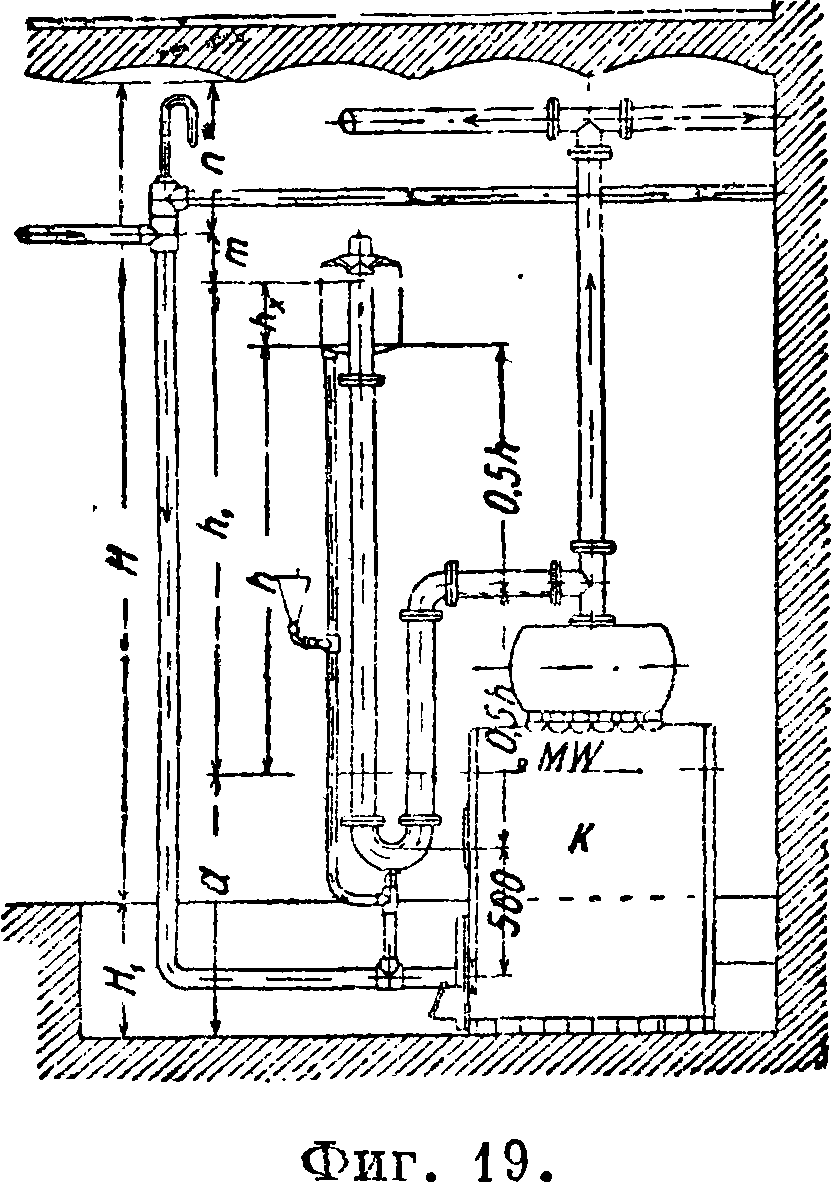 где h1 — высота выбрасывания воды над средним уровнем MW воды в котле; h± — h hx h — наибольшее желаемое рабочее давление в миллиметров вод. ст.; h — 10 000 р р — наибольшее желаемое рабочее давление в aim избыточных; hx — повышенное избыточное давление; hx ==· 200 -т-300 миллиметров вод. ст.; а — высота среднего уровня MW воды в котле над местом стояния его; т— высота, обусловливаемая надежностью удаления воздуха из системы; m ^ 100 миллиметров п — расстояние в миллиметров от середины потолкового конденсационного трубопровода до потолка; это расстояние обусловливается расположением частей оборудования и удобством их монтажа; величины Я и Нг выражаются также в миллиметров. Сливной штуцер для конденсационной воды у. бойлера должен быть расположен по крайней мере на величину h± выше среднего уровня MW воды в котле, причем — h -f- hx. При низком давлении пара конденсационная вода м. б. направлена в котел для efo питания; при среднем и высоком давлении пара следует в конденсационный трубопровод включить конденсационный горшок или другой подходящий прибор, обеспечивающий вытекание конденсационной воды, а не выбрасывание пара.