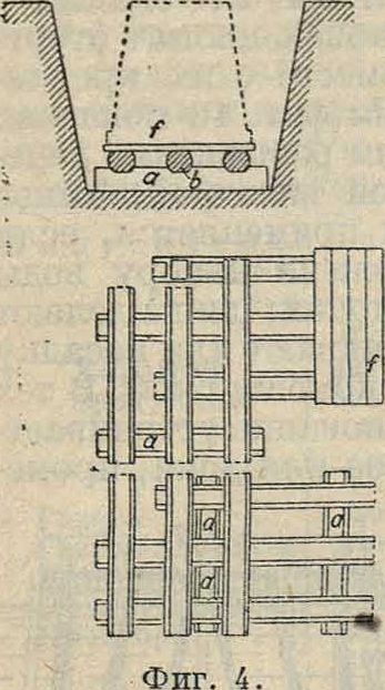 выми бревнами дпам. 27—32 см, отесанными на два канта. На фигуре 4 показан такой Р. под фундаментом здания; здесь: а—поперечины, укладываемые по ватерпасу на дно фундаментных рвов; 6—прогоны в 3 ряда в расстоянии около 0,55 метров друг от друга; врубки в поперечинах—в 1/i дерева и меньше; /—половой настил из 7—8-с.м досок, прибиваемых к прогонам 15-см брусковыми гвоздями; в плане показано: