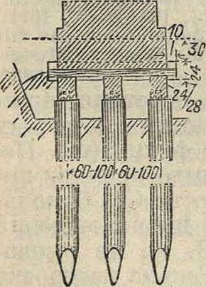 где р—нагрузка в килограммах /ж2; I—расстояние между продольными крайними рядами свай в м; а—допускаемое напряжение на изгиб бетона в килограммах/см2. Если по местным условиям требуется применение пшунтовых рядов, то бетонный