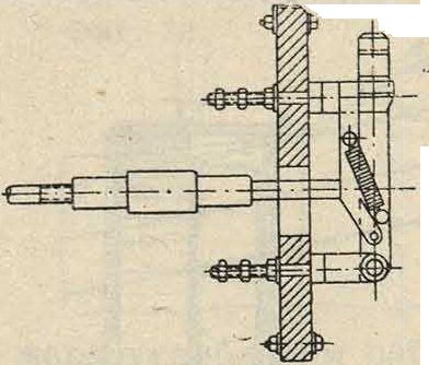 На фигуре 2 изображен двухполюсный Р. с мгновенным выключением. Последнее осуще ствляется при помощи двух вспомогательных ножей, скользящих по внешней боковой стороне пружинящего контакта. Вспомогательные ножи соединены с главным ножом пружинами. При отходе главного ножа из пружинящего контакта обе пружины натягиваются, и как только сила натяжения пру-