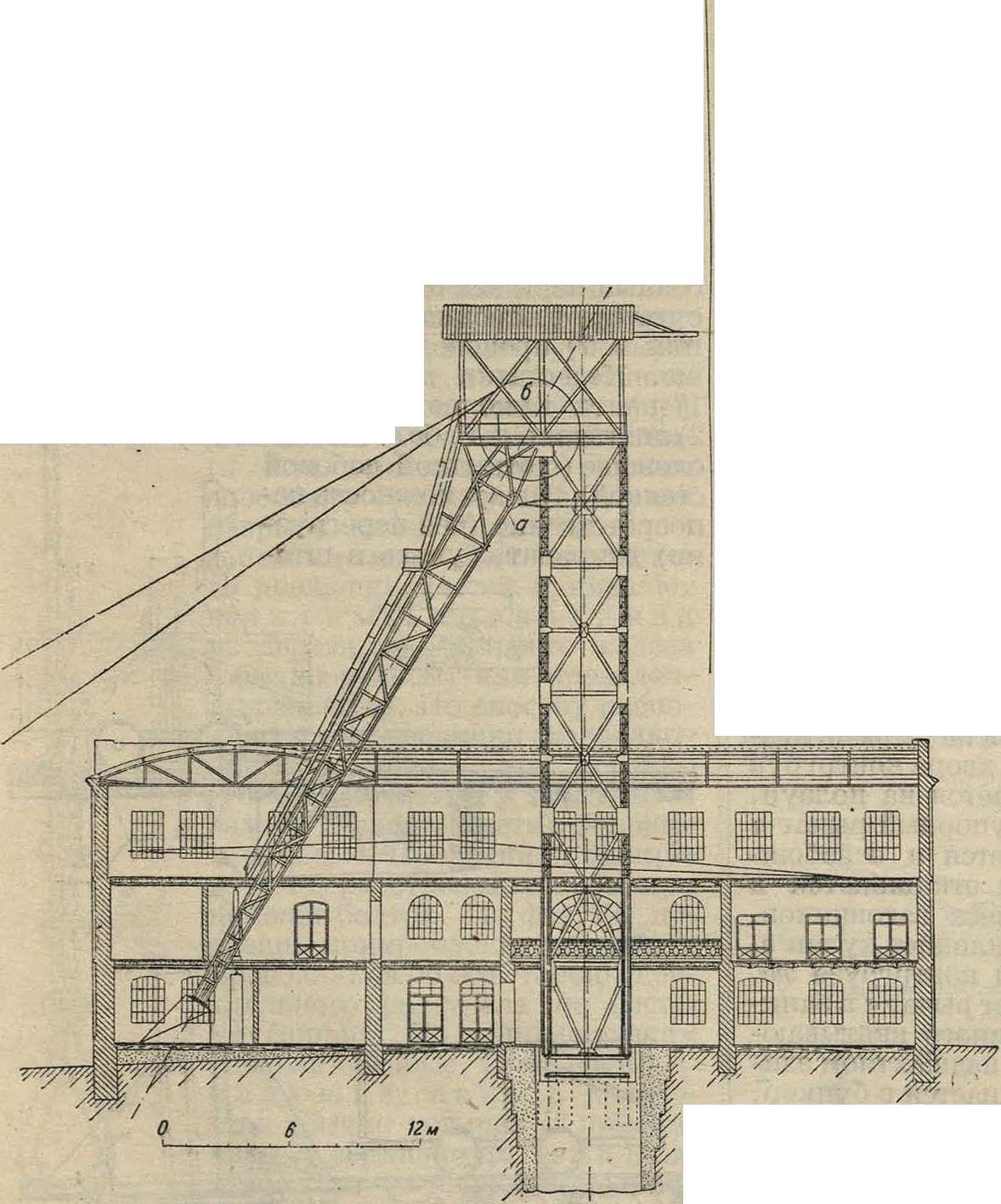 Р. п. в эксплоатацпониых шахтах, так называемым шахтный подъем, при все увеличивающихся глубине шахт и количестве добываемого полезного ископаемого является одним из главных факторов разработки месторождений шахтами. Шахтная подъемная установка состоит из копра а (фигура 3) с укрепленными на нем двумя направляющими шкивами б, подъемной машины с барабаном для навивки канатов и прикрепленных к ним подъемных сосудов. В соответствии с этим шахтные подъемные установки классифицируют по следующим четырем признакам: по роду подъемных сосудов, по органу навивки каната, по способу уравновешивания системы подъема и по роду двигателей.По первому признаку шахтный подъем разделяется на подъем в клетях и подъем в скипах. В первом случае ископаемое, доставленное от забоя к шахте в вагончиках, не перегружается, а выдается на поверхность в тех же вагончиках; во втором случае ископаемое на рудничном дворе перегружают в особые ящики,так называемые «скипы», и в них выдается на поверхность.