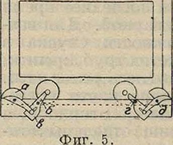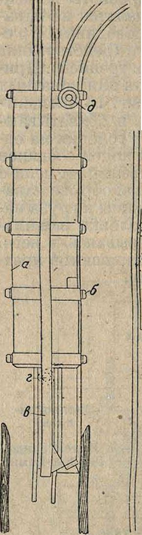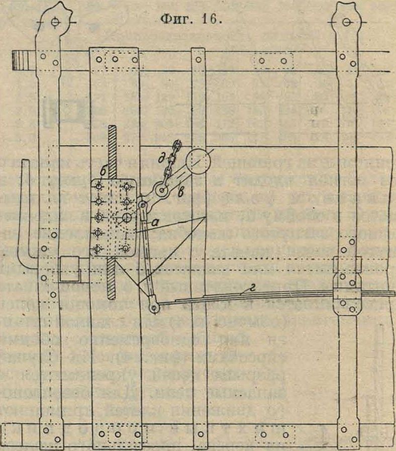 Для избежания этого применяют приспособления. которые могут оттягиваться назад в то время, когда на них стоит клеть. Одно из таких приспособлений (Westmeyer’a) дано на фигуре 11. Рычаги а вращаются на осях б; рукояткой в при помощи тяги г и плеча рычага