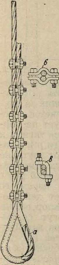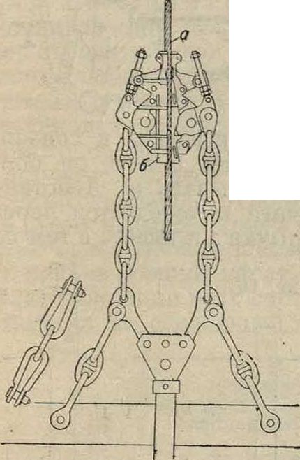 меняемые за границей. Нижняя часть каната а без изгиба входит в зажимную буксу б; в канатном узле (фигура 9) канат вкладывается в обойму а, изготовленную в виде железного загнутого желобка; защемление загнутой частиj каната с прямой его частью производится или зажимом б или угловыми пинтами в Приготовленный т. о. конец каната присоединяется к клети при помощи цепей (обычно их 4) или главной штанги или одновременно обоими способами (фигура 4). На случай разрыва цепей укрепляются 4 запасные цепи. Для безопасного движения клетей применяют шахтные проводники из дерева, профильного железа (обычно рельсы) или проволочных канатов. По способу расположения проводники разделяются на головные, или лобовые (устанавливаются у передней и задней стороны клети), боковые и угловые. Проводники прикрепляют к расстрелам, гл. обр. при помощи болтов. На фигуре 10 показано прикрепление рельсовых проводников по обе стороны центрального расстрела по системе Бриара. По направляющим скользят особые, т. н. н а п р а-вляющие, лапы в количестве обычно четырех (2 привинчены к верхней раме и 2 к нижней). Для уменьшения толчков Фпг. 9. и предохранения проводников от слишком быстрого изнашивания в старых, потерявших первоначальную вертикальность, шахтах применяют лапы с каучуко-вой прокладкой или со стальными пружинами; иногда в этих случаях вверху клети укрепляют ролики. Канатные направляющие устанавливают в шахтах малых и средних глубин; при больших глубинах применение их опасно вследствие их провисания и раскачивания.