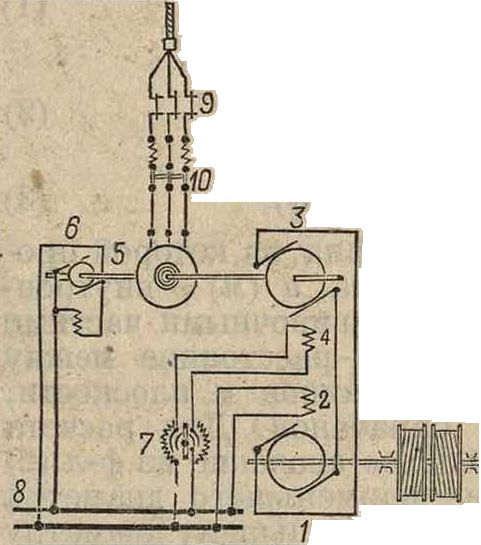 Приводы.Породу привода установки бывают с паровыми подъемными машинами и электрическими подъемными машинами, среди которых можно выделить три основные системы: а) с асинхронным подъемным двигателем трехфазного тока и зубчатой передачей (ординарной или двойной); б) с подъемным-двигателем постоянного тока и умформерной группой сист. Леонарда (с зубчатой передачей пли без нее, с непосредственным соединением вала барабана с валом тихоходного мотора); в) то же, но только добавляется маховик Ильгнера в умформерной группе и регулятор скольжения для асинхронного мотора в умформер-ной группе. Область применения трех перечисленных систем установки с асинхронным мотором применяется сравнительно Меньшей мощности и главным образом на тех установках, где режим работы двигателя мало меняется,·—например скиповые подъемы и клеть-евые подъемы с мало меняющимися функциями подъемов, где возможна работа с одинаковыми максимальными скоростями подъема. К недостаткам установок с асинхронным мотором следует отнести большие нагрузки наэлек-трич. подстанции при пуске машин в ход (пусковая мощность составляет обычно ок. 180% от установленной подъемного мотора); к достоинствам—меньшая стоимость их. Установки с умформерной группой сист. Леонарда благодаря возможности производить регулирование скорости Р. п. почти без потерь энергии позволяют выбрать диаграммы подъема, дающие небольшие перегрузки на электрической подстанции, и кроме того легко автоматизировать подъем. Для очень крупных установок, где необходимо выравнять нагрузку станции, применяется система Ильгнера-Лео-нарда: маховик умформерной группы накопляет энергию в моменты неполной нагрузки асинхронного мотора и возвращает ее при перегрузках.Схема установки по оистеме Леонарда приведена на фигуре 32, где 1— подъемный мотор постоянного тока с независимым возбуждеииемЗ; 3— пусковая динамо с независимым возбуждением 4; 5—, • умформерный мо-^ тор; 6—динамо-возбудитель; 7—реостат; 8—шины, питающие обмотки возбуждения 2 и4; ,9—разъединители; 10—автоматический максимальный выключатель; И—барабан подъемной машины.