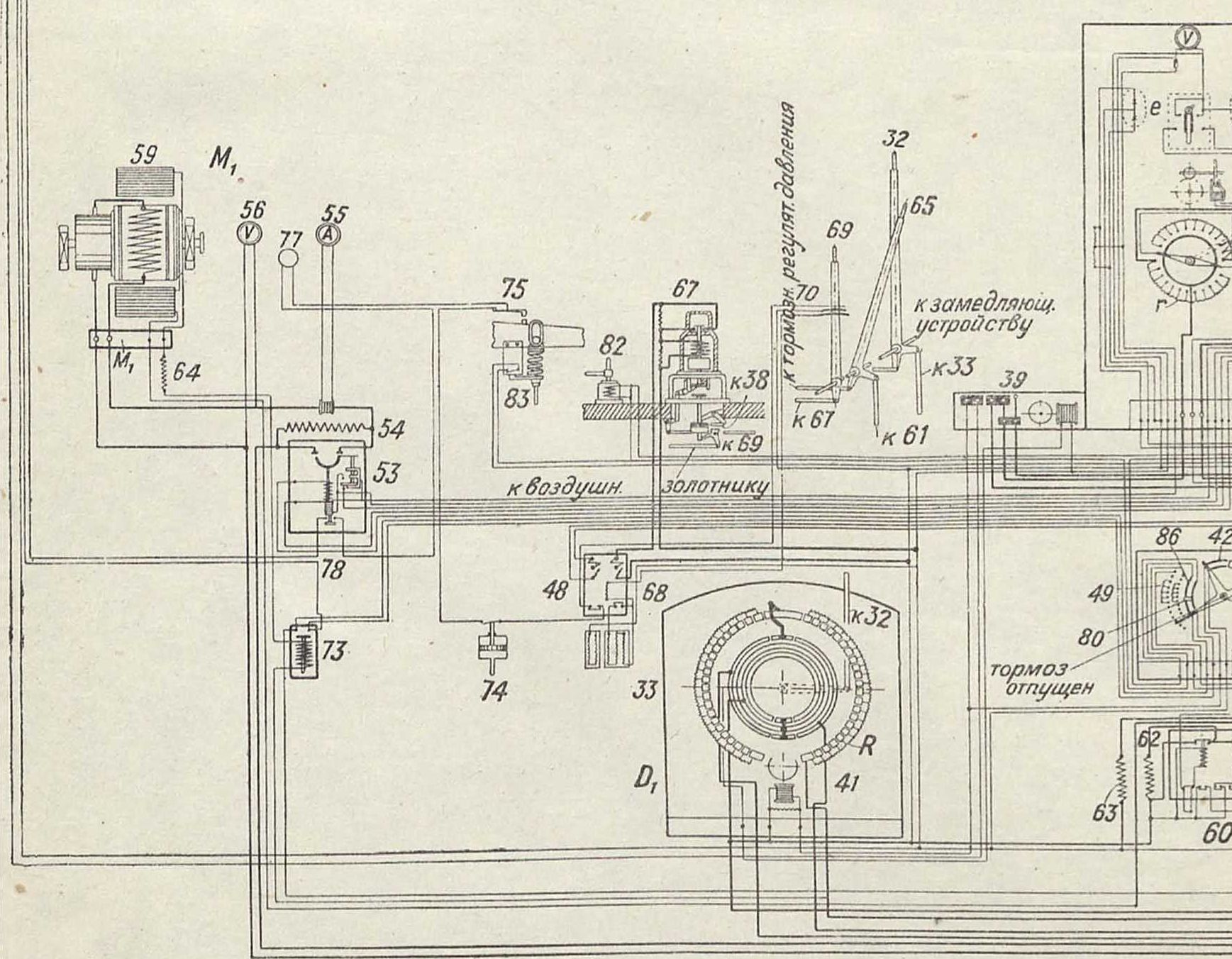 Фигура 33: 7—разъедипители; 2—общий для двух подъемов автом; тич. масляный трехиолюспый выключатель; L—шины, которые спабжак током два умформерных мотора 27; з—измерительный трансформато напряжения, служащий для включения вольтметра 4; 6—автомата1 масляный выключатель о максимальными электромагнитами в дву фазах каждой цепи, питающей соответственный умформерный мотор 2. О—сигпальные лампы у выключателя 3; 7—измерительный трансфо; матор тока, служащий для включения максимальных элсктромаглптс выключателя 5, амперметра ю, сериесных обмоток ваттметра 11 счетчика 72; 8—измерительный трансформатор напряжения, служащи для включения минимального электромагнита выключателя 5, волы метра 0, шуптовых обмоток ваттметра 77 и счетчика 72; 73—трансфо; матор, первичная обмотка которого включена в цепь, питающую умфо; мерный мотор 27, вторичная же питает статор сервомотора 19, обсл; живающего регулятор скольжения 78; и, υ, w—неподвижные электр: ды: ж, у, t—подвижные контрэлектроды, подвешенпые к одному кони рычага I, укреплеппого на валу сервомотора 79; к другому концу рь чага ( подвешен контргруз /; 10—ступенчатый выключатель, служ; щий для регулирования напряжения, подводимого к сервомотору 7: 17—выключатель длп замыкания накоротко обмоткп статора сервом, тора 79 (в положении, изображенном па схеме, ток пз трансформ; тора 73 пе идет в сервомотор); 29—выключатель, замыкающий нак: ротко цепь ротора умформерного мотора 27 с включающим и выклк чающим электромагнитами; 27—умформерный мотор; 22 (Бi—Е%)~ дипамо-возбудитсль; 23—контактный тахометр (на валу умформерног агрегата); 23—автоматич. шунтовой регулятор динамо-возбудителя 2; S—мотор, производящий включение в цепь возбуждения дипамо-возб; дителя и выключение из нее реостата q; 24—реле, приводящее в де: ствие мотор S; 26—амперметр и 27—вольтметр, оба для дипамо-возб; дителя 22; 28—роговые предохранители; 29—главный переключатся] оп состоит из двух частей; верхней В, служащей дли соответственное переключения пусковых динамо Лу—А2 и подъемных двигателе —М2, и нижней С, предназначенной для переключения динамо-во: будителен ΐ· —Е2 и соответственных частей коммутационного устро( ства аппаратов управления, шуптовых регуляторов и тому подобное. Часть В с< стоит из неподвижных (соединенных электрически соответственным пусковыми динамо и подъемными двигателями) проводящих поле (iVj—Nlt Р, TV, p2 В левой и ιΥ2—TV a, Pi, JVj, P2 в правой половит из монтированных па валу переключателя полуколец; α, β,γ, δ—обр; зующие; 32—рычаг управления, действующий при помощи тпг в аппарат управления; 33 (Dx—1)а)—аппарат управления, служащи для включения в цепь возбуждения пусковой динамо 34 (А,—Л2)