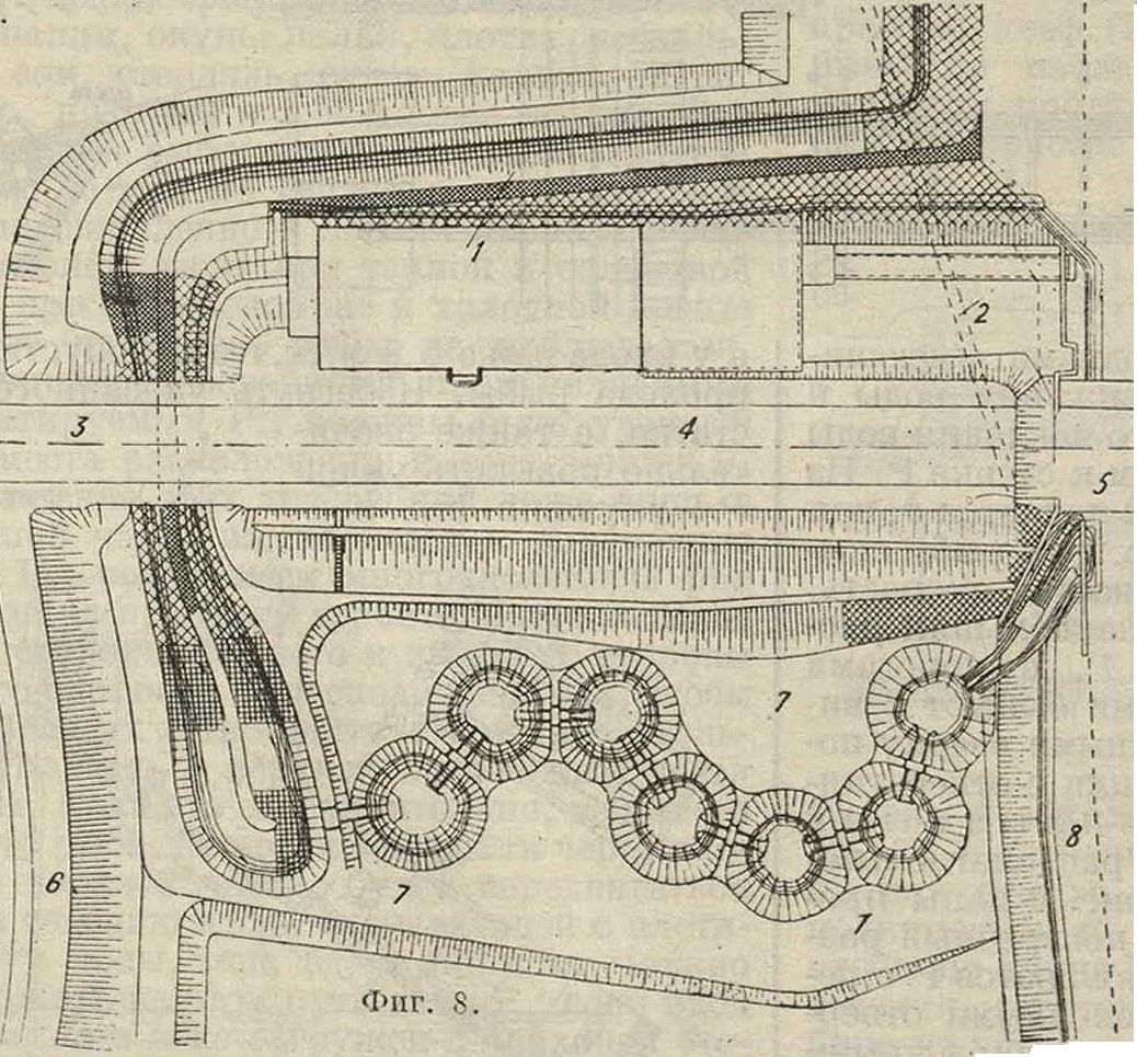 8—мостовая на цементе. Р. состоит из ряда бассейнов, соединенных между собою узкими лотками—каналами. Бассейны имеют форму усеченного конуса с заложением откосов"2 :1 с диам. зеркала воды 5 метров и дна 1 метров Каналы, соединяющие бассейн, представляют собою лотки усиленной шероховатости сист. Дениля и располагаются так, чтобы образовать в смежных бассейнах наиболее длинный путь с водоворотами и тиховодами для отдыха рыбы. Несмотря на сравнительно высокий переход между бассейнами, а именно 0,45 м, эксплуатя показала высокие качества этого рыбохода в особенности для прохода через него лососей.