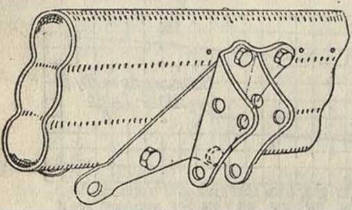 вышения устойчивости лонжерона плоские стенки укреплены добавочными приклепанными деталями, что неизбежно ведет к увеличению веса и удорожает производство. Как переход от деревянных к стальным конструкциям следует признать решетчатые стальные лонжероны фирмы Глостера (фигура 57) и фирмы Суперма-рин, набор крыла которой изображен на фигуре 58. Производство этих конструкций в виду затруднительности сборки и обилия ручной клепки стоит довольно дорого и не оправдывает ни своей цены ни трудностей пригонки отдельных деталей. Пустотелые заклепки, служащие для соединения отдельных деталей стального набора крыла, штампуются из мягкой стали. Расклепка их в случае открытой клепки производится или вручную посредством приспособлений вроде щипцов для укрепления пистонов, применяющихся в кожевенной фурнитуре, или клепальными машинками различных конструкций. При клепке закрытых профилей (например при клепке труб) широко применяется метод клепки с одной сто-роны, изображенный на фигуре 59. При такой клепке заклепка а насаживается на оправку b с конич. головкой и вместе с оправкой вставляется в отверстие. Высовывающийся конец оправки захватывается особым зажимом и вытаскивается наружу; конич. головка оправки отжимает в стороны края заклепки и либо протаскивается сквозь пустотелую заклепку либо обрывается внутри трубы, в зависимости от выбора материала для оправки. Обычно этим материалом является сталь с прочностью 95 килограмм/мм2. В случае клепки с обрывом головки оправка делается из мягкой стали и головка ее закаляется.·