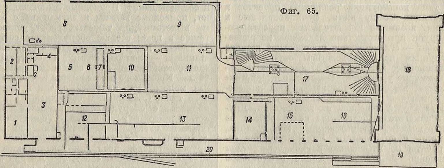 Помимо завода Бреге во Франции большой интерес с точки зрения организации производства, а также построек и оборудования представляет з-д Глен-Мартин в Балтиморе, являющийся одним из самых крупных и новых самолетостроительных з-дов в США. 3-д окончен постройкой в конце 1930 г. и предназначен для постройки крупных металлич. самолетов и гидросамолетов как дуралюминовой, так и стальной конструкции. Проект завода предусматривает для полного осуществления 10-летний период; в настоящей же стадии выполнена только 7з полного плана, причем предусмотрена возможность расширения зданий на 50 лет. В своем настоящем виде з-д может давать еженедельно до трех штук больших трехмоторных гидросамолетов, то есть до 160 шт. годовой производительности в одну смену при 1 700— 2 000 рабочих. План завода (фигура 65) показывает но сборочные цехи: цех крыльев и поплавков 9 и лодочный цех 11, за к-рыми следуют отделочные цехи: гальванопластики и анодирования 14, малярный и обойный 17. Общесборочный цех 18, он же лётный ангар, расположен в торце здания и прилегает к отделочным цехам, к моторному цеху 19 и упаковочному цеху 16 с деревообделочной мастерской 15. По фасаду здания завода расположена разгрузочнопогрузочная платформа 20, обслуживающая нужды складов сырья и упаковочно-экспедиционного цеха. В результате такого расположения получается производственный поток с минимумом обратных движений. Здание завода представляет один блок длиною ок. 280 метров и шириною 90 м, причем здание имеет два ряда колонн с пролетами 30,5 и 38 метров и расстоянием между колоннами около 7,7 метров.