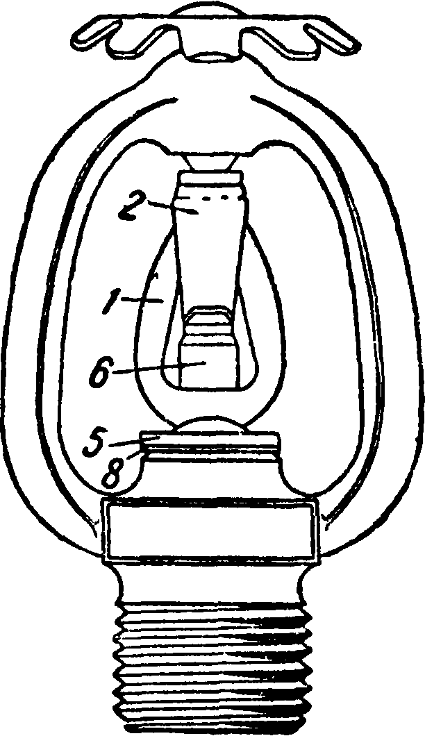 янных между собою особым припоем. Осевая линия замка расположена несколько сбоку от осевой линии всего спринклера, потому замок стремится распасться как от давления воды в сети, так и потому, что в собранном С. диафрагма сильно пружинит, способствуя вылету замка; для этого диафрагма зажимается между конич. поверхностями штуцера 1 и дуги 2, и замок заводится в С. с усилием, выпирающим диафрагму в сторону, обратную выпучиванию ее, вызываемому наличием упомянутых конич. поверхностей. Как только припой, связывающий части замка, расплавится, то весь замок с большой силой вылетает из С., стеклянный клапан 4 отпадает, и вода в форме душа получает выход к защищаемой площади. При возникновении огня С. вскрывается от повышения обычной t° помещения, в зависимости от которой выбирается Ь°пЛш легкоплавкого припоя. Для помещений с обычной t° до 40° С. ставятся на температуру вскрытия в 68—74°, для помещений с обычной t° в 40— 60°, 60—100° и свыше 100° соответственная t° вскрытия С. назначается в 93, 141 и 1S2°.