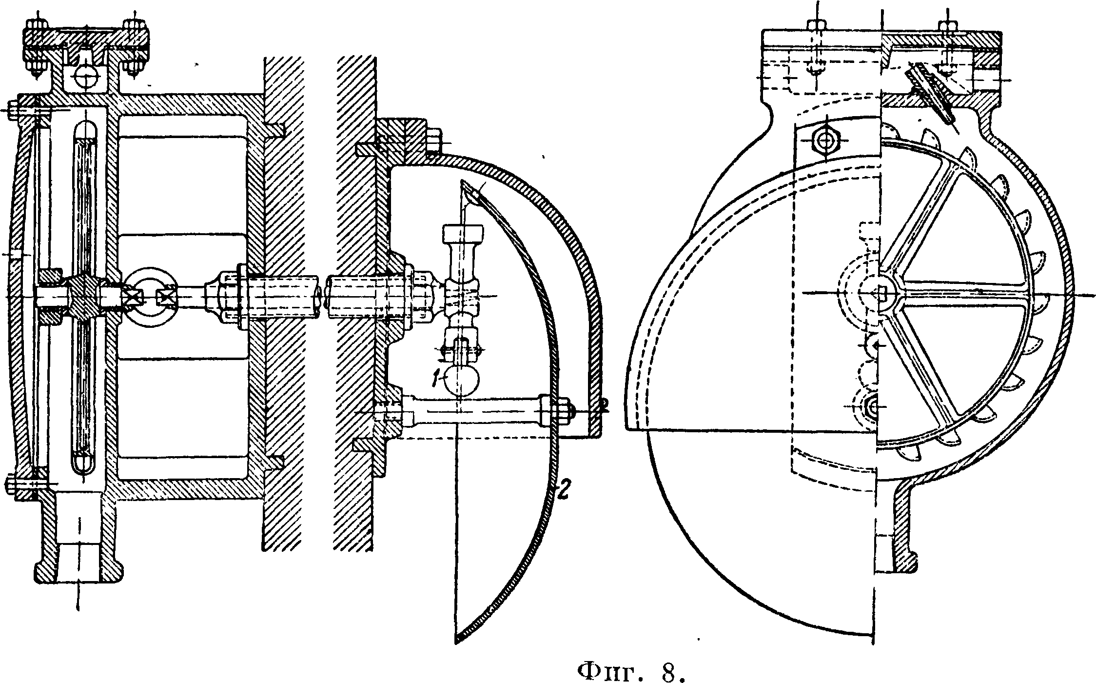 отверстием диам. 12,7 миллиметров O/2 дм.). На конце дуги 2 укреплен дефлектор 5 с зубчатыми краями, служащий для разбрызгивания воды после выхода ее через отверстие в диафрагме. Отверстие диафрагмы прикрывается стеклянным клапаном 4 при помощи замка б—7—8, состоящего из трех пластинок из красной меди, спа-