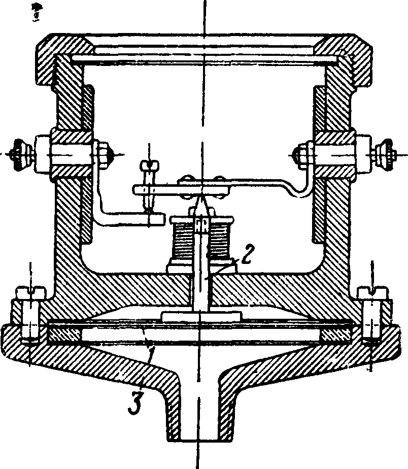 Сигнальный аппарат (водяной) состоит (фигура 8) из турбинки, работающей от давления воды, подаваемой от контрольносигнального клапана; турбинка вращает боек 1, ударяющий по гонгу 2. Входит в практику постановка в дополнение к контрольно-сигнальному аппарату иэлектрического сигнала (фигура 9), что особенно важно на предприятиях с большими корпусами и территориями при значительном числе отдельных инсталяций. Здесь при посредстве диафрагмы 1 и стержня 2 под давлением воды, поступающей в камеру 3 от контрольно-сигнального клапана, постоянный контрольный ток в сигнальной сети переключается в случае пожара на новое направление, вызывающее сигнал тревоги.