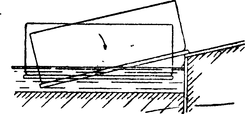 Возможен случай, когда спускаемое судно может получить вращение в той же плоскости, но в обратную сторону. Подобное вращение происходит около порога подводной части спускового фундамента и называется опрокидыванием. При переходе вертикальной составляющей силы тяжести G (фигура 5) за порог свешивающаяся часть судна будет вращаться в сторону погружения. Подобное же явление мо-
