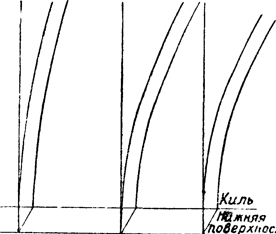 жения судна во время спуска. Наиболее удобный способ вычисления водоизмещения заключается в построении масштаба Бонжана судна вместе со спусковым устройством, для чего в обычный масштаб Бонжана вводится поправка на объём (или площадь поперечного сечения) салазок (фигура 6). По исправленному масштабу Бонжана определяются погруженные в воду площади шпангоутов. судна и спускового устройства Фигура 6. и соответственные водоизмещения по последовательные ватерлинии, параллельные уровню воды, то есть ватерлинии, наклонные к килю (фигура 7). Пользуясь масштабом Бонжана, нетрудно определить пловучесть d при погружении по различные ватерлинии, то есть построить грузовой размер, а также определить абсциссу центра величины (точнее—положение перпендикулярного килю шпангоута, на к-ром находится центр величины). Вертикальное положение последнего определяется обычным пу-