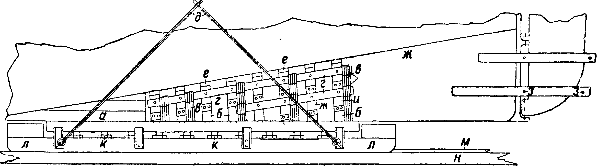 длинными продольными бревнами в— оглоблями и прижимаются к судну выми канатами—н айтовами в. Помимо указанных выше обозначений на фигуре 14 изображены: круговой найтов б, связывающий салазки с судном во избежание сдвига, е—упорный угольник, в который упирается верхний конец копыльев в том случае, когда угол встречи копыльев с обшивкой весьма велик, ж—обшивочный паз, з—болты, связывающие брусья, препятствующие повороту руля при спуске“