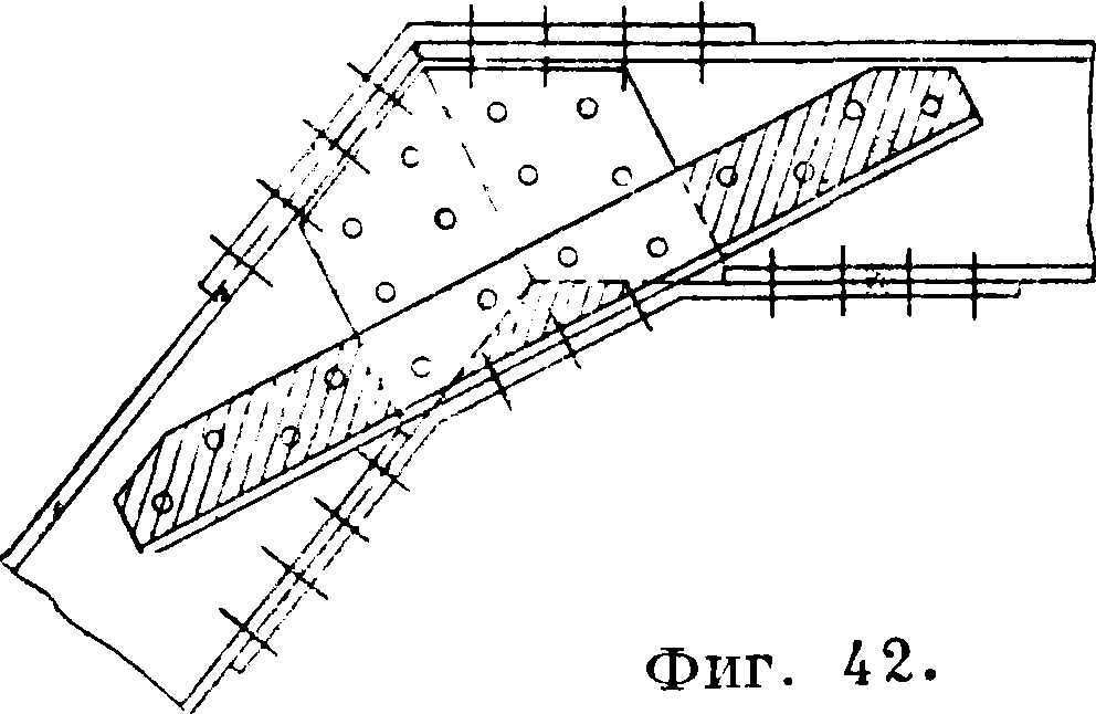 Опорой стоек может служить толстая плита из литой стали (фигура 39). Опорное усилие м. б. передано также на трапецеобразный узловой лист (фигура 40). В первом случае соприкасающиеся плоскости подлежат тщательной обработке. В рамах полочные накладки должен быть расположены с внутренней стороны в том случае, когда на рамный угол действует положительный изгибающий момент (вверху сжатие,