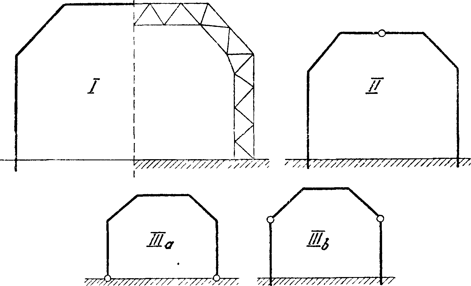 Поперечное сечение здания может быть образовано жесткой стальной рамой, причем безразлично, будет ли рама состоять из сплошных сечений или представлять собой решетчатую систему (фигура 62). Такая рама три раза статически неопределима. При одном шарнире получается система, два раза статически неопределимая (II), при двух шарнирах мы имеем дело с системой, один раз статически неопределимой (III), а при трех шарнирах — с системой, статически определимой (IV), причем положение шарниров может быть произвольное при одном лишь условии, чтобы они не были расположены на одной прямой линии. На фигуре 62, IVc показана уголковая рама. Схема ШЬ представляет собой вместе со стропильными фермами и опорными стойками обычное поперечное сечение фабричных зданий с крановым оборудованием (фигура 63); заделка опорных стоек в данном случае упрощает конзтрукцию. Но фундаменты получаются при этом тяжелые и дорогие, а достаточная боковая жесткость достигается только очень широкими опорными стойками с сильным их закреплением анкерами. Поэтому б. ч. дают