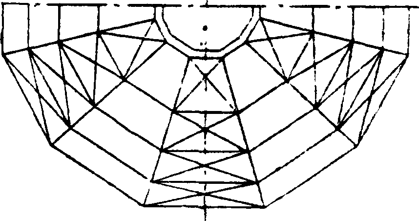 ние пятовым кольцом, что создает купольное действие. Полустропильные фермы крепятся между собой связями, лежащими в плоскости крыши. При полностенных стропилах получается ребристый купол. В этом случае может оказаться целесообразным прибегнуть к жесткому соединению ребер с опорами (фигура 92). Другая возможность постройки куполов состоит в том, что все стержни решетки располагают в плоскости крыши, оставляя свободным все внутреннее пространство купола; получается решетчатая оболочка купола. Эти куполы, впервые построенные Шведлером, состоят из плоских полигональных стропильных ног, горизонтальных колец и обыкновенно двух диагоналей, расположенных в тра-пецеобразных полях, ограниченных стропильными ногами и коль-цами(фигура17 и 93). И в этой системе С.к. имеется пятовое кольцо и фонарное (ключевое) кольцо. Если ка-Фигура 93. Фигура 94. ждое кольцо повернуть по отношению к предыдущему на половину центрального угла, то стропильные ноги и диагонали не будут ничем отличаться друг от друга, все поля будут представлять треугольник pi получится сетчатый купол (фигура 94). Другой род оболочечных фахверковых куполов представляет собой купол сист. Циммермана, у которого число сторон горизонтальных полигонов уменьшается кверху, а в зонах встречаются тр-ки и четырехугольники (фигура 95). При наличии