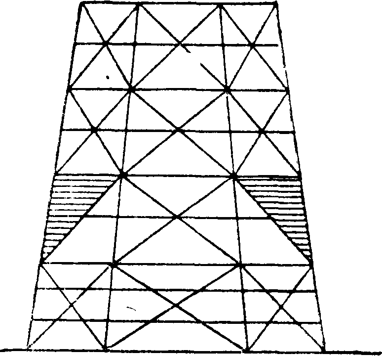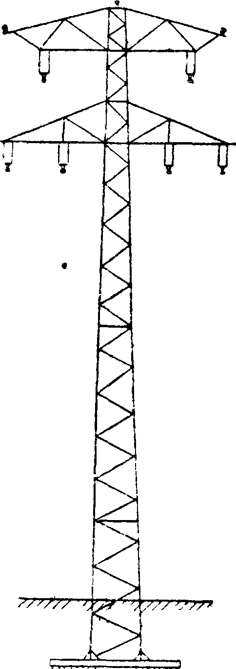 бе консоли для подвесных изоляторов (фигура 98). На мачты действуют собственный вес проводки, вес льда, давление ветра и горизонтальные силы, действующие в продольном направлении при различных пролетах. На угловые мачты действует кроме того результирующая горизонтальная сила. Мачты верховой проводки в местах пересечений должны иметь достаточную высоту с учетом провисания проводов этой проводки. Пояса состоят из одного или, при больших высотах, из нескольких уголков. Развертка на фигуре 99 показывает расположение стержней решетки, увеличивающее прочность поясных уголков в о ношении продольного изгиба. Для передачи момента заделки на грунт при сравнительно малой вертикальной силе требуются прочные фундаменты, стоимость которых при плохом грунте может составить значительную часть общих расходов. Применимы в данном случае балочные фундаменты, ростверки, сваи. На фигуре 100 показана ферма, покоящаяся на двух мачтах и служащая для поддержания расположенной на ней электрической проводки для трамвайных линий. Радиобашни строятся двух родов: с оттяжками и без таковых. Высота 100—200 метров Нагрузка—вес антенного каната с натяжным грузом, собственный вес и давление ветра. Радиомачты представляют собой узкие, б. ч. четырехгранные решетчатые конструкции с шарнирной пятой, удерживаемые в вертикальном положении через цаждые 40—50 метров по Ьысоте тремя проволочными оттяжными канатами (фигура 101). Под опорной точкой и у точек закрепления канатов располагают изоляторы. Радиобашни имеют б. ч. четырехугольное или трехугольное сечение и конструируются свободно стоящими без оттяжек, но с закоепленными анкерами, изолированными опорами. Большие панели решеток радиобашен разделяют на меньшие длины для предохранения поясов от продольного изгиба (фигура 102). В башнях устраивают половые настилы иди платформы, причем на нижней располагают канатную лебедку для натяжного груза антенны, а к верхней прикрепляют антенну. На верх башен ведут легкие лестницы. Трехугольная радиобашня в Вустергаузене высотою 230 метров весит 450 т, и прототип всех стальных