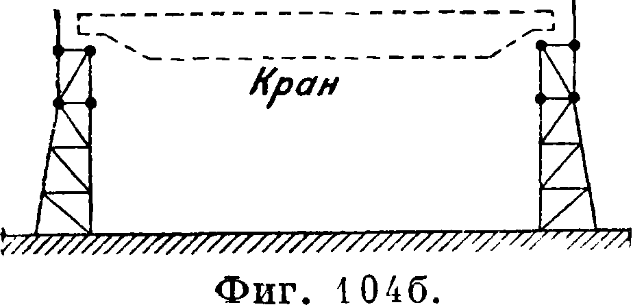Фигура 104а. расположены рельсовые пути для дальнейшего транспортирования материалов. Каркасные опоры сооружаются соответственно с большой4 величиной поддерживаемого ими груза особенно прочно с диагональным креплением или в виде рамной конструкции. Свободно стоящие крановые пути для складов и тому подобных сооружений могут иметь опоры, соединенные между собой по направлению движения кранов и образующие тогда многопролетные рамы или решетчатые мосты (фигура Ю4а и 104^). Электрич. подвесные пути имеют решетчатые опоры с^ заделанными пя:ами с ординарной или двойной укосиной, к концу которой прикреплена балка, служащая путевым рельсом (фигура 105). Подобно этому устраиваются и опоры канатных дорог. На концах консолей имеются расположенные в направлении каната канатные держатели в виде изогнутой выпуклой вверх балки длиною в несколько метров, в жолобе которой скользит несущий канат.
