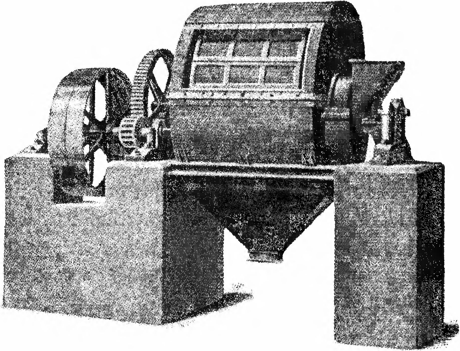 Чтобы получить как можно более чистое, прозрачное и бесцветное стекло, надо брать по возможности самые чистые, свободные от примесей сырые материалы. Примеси меняют цвет стекла, его блеск, прозрачность и другие свойства. Иногда, однако, вводят эти примеси нарочно, чтобы придать стеклу заранее желаемые особые свойства. Все вещества, идущие для варки стекла, должны быть кроме того сухи и мелко измельчены. Песок уже в природе большей частью встречается в измельченном виде, так что его остается только отсеять. Другие составные части должны быть размолоты. Для этого служат разные машины и аппараты, из которых здесь можно указать на обыкновенные жернова, шаровые мельницы (рисунок 134), бегуны с ситами (рисунок 135) и другие.