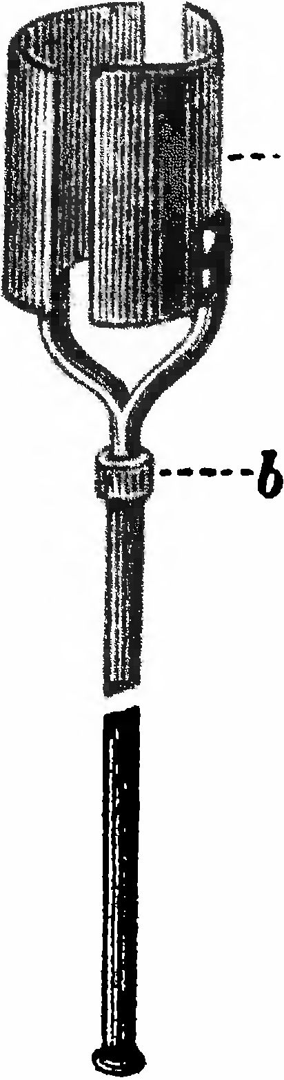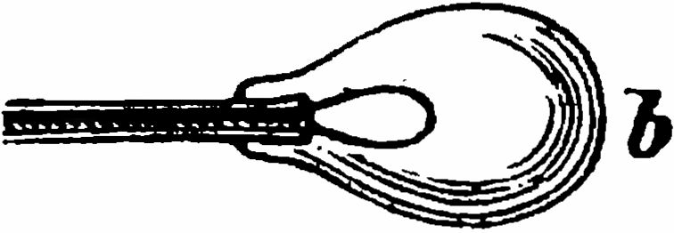 В настоящее время при изготовлении бутылки обходятся без понтии, пользуясь так называемым „хватком“ (рисунок 153), то есть длинными щипцами с концами в виде двух полуцилиндров а, которые могут быть сдвинуты и раздвинуты посредством кольца b, чем обеспечивается плотный захват бутылки. Ясно, что хваток гораздо удобнее понтии.