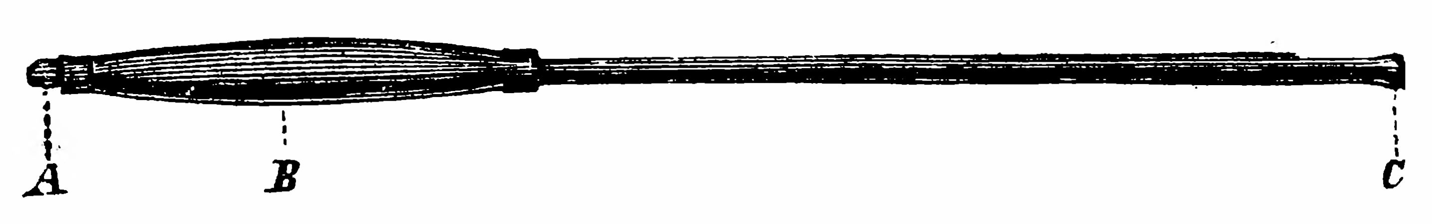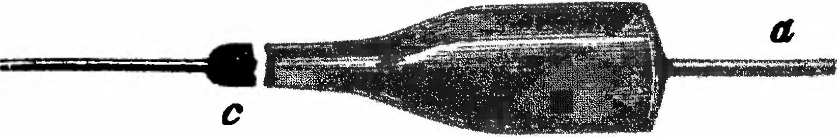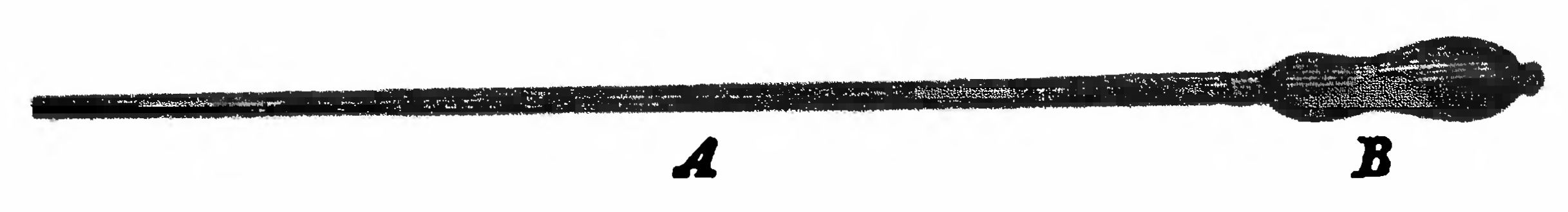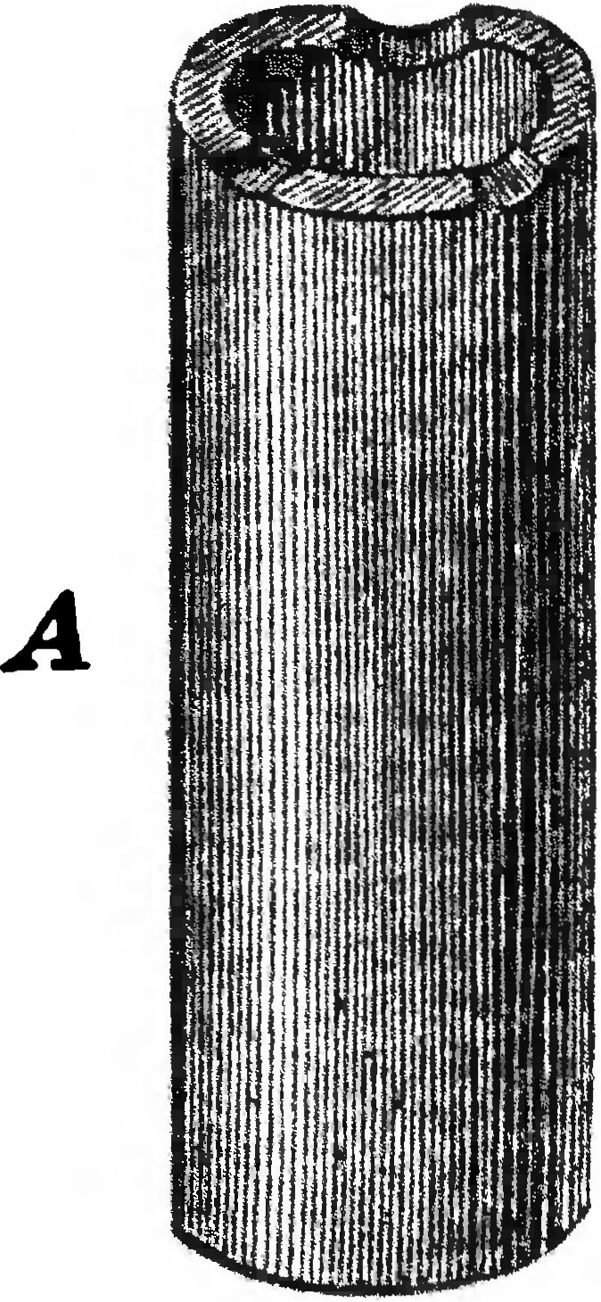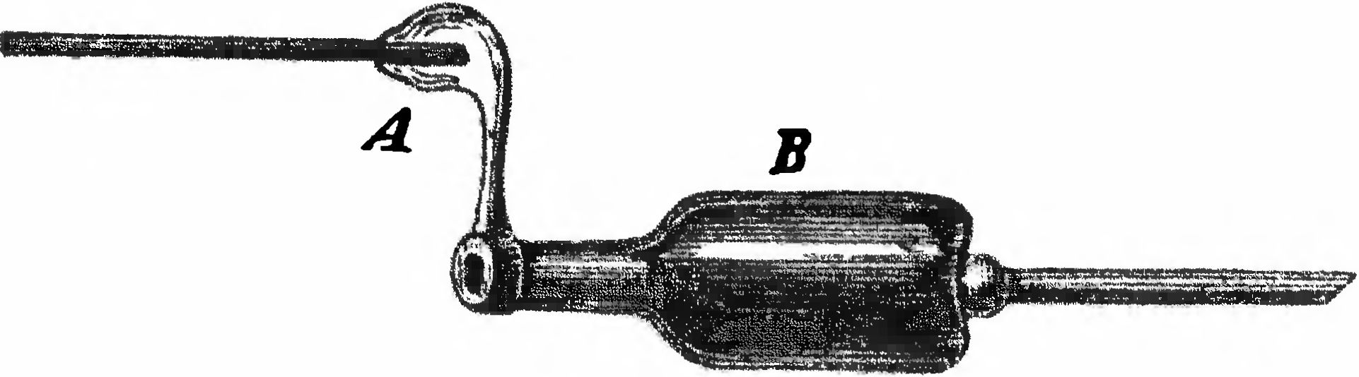 1—11/2 м и толщиной в палец (рисунок 141). Чтобы защитить руки мастера от жара, в том конце, где находится мундштук или сосок A, который берется в рот для выдувания, трубка плотно одевается, приблизительно на одну треть, другой деревянной трубкой, называемой папыштелем; на другом конце находится коническое расширение, которым набирается стеклянная масса.