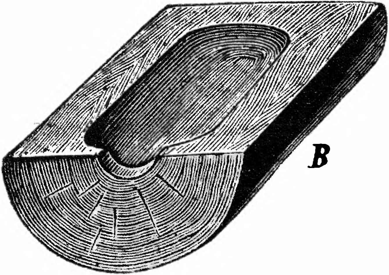 либо из металлического кружка того же диаметра, что и бутылка, с возвышением, соответствующим ее впадине (рисунок 148). Затем к середине дна бутылки мастер прикрепляет посредством комочка стекла так называемую понтию (рисунок 149), состоящую из железного стержня А с деревянной рукояткой В, после чего, держа бутылку за понтию, капает на место соединения трубки с горлышком бутылки водой, почему в этом месте получается трещина; сухим ударом по ней трубка окончательно отделяется (рисунок 150).