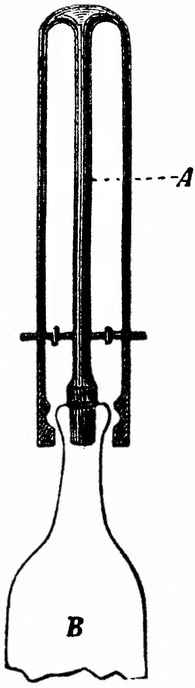 Наконец горлышко бутылки охватывается венчиком или обручиком, как это показано на рисунке 151: здесь В — бутылка на понтии и А — кусок железа с тянущимся с него и навертывающимся на горло бутылки стеклянным жгутом.