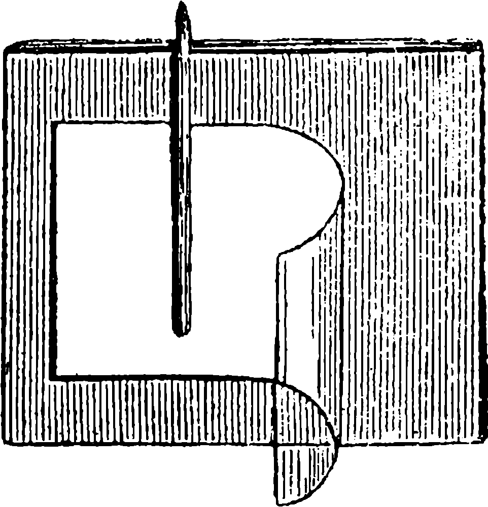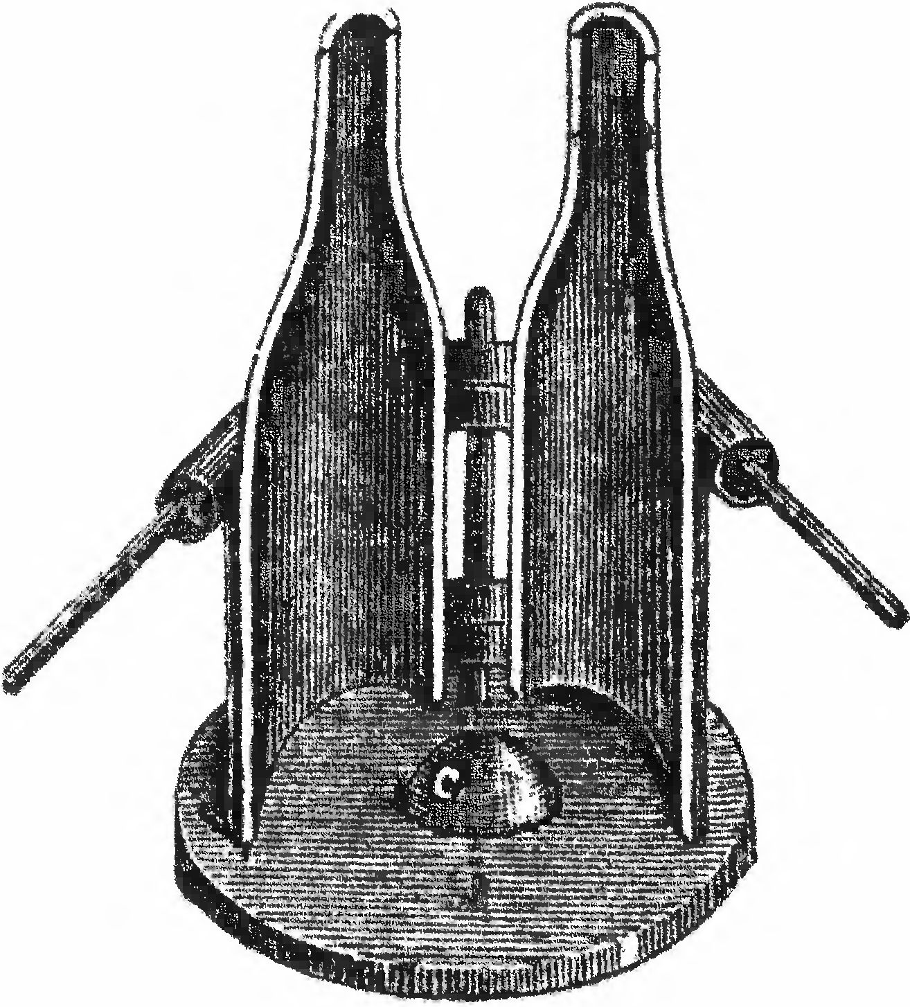После этого в будущем в дне бутылки выдавливается впадина деревянной лопаткой или тупой железкой или, наконец, особой формы инструментом, состоящим либо из рукоятки с переставляемым железным кружком Р и закругленным возвышением (рисунок 147),