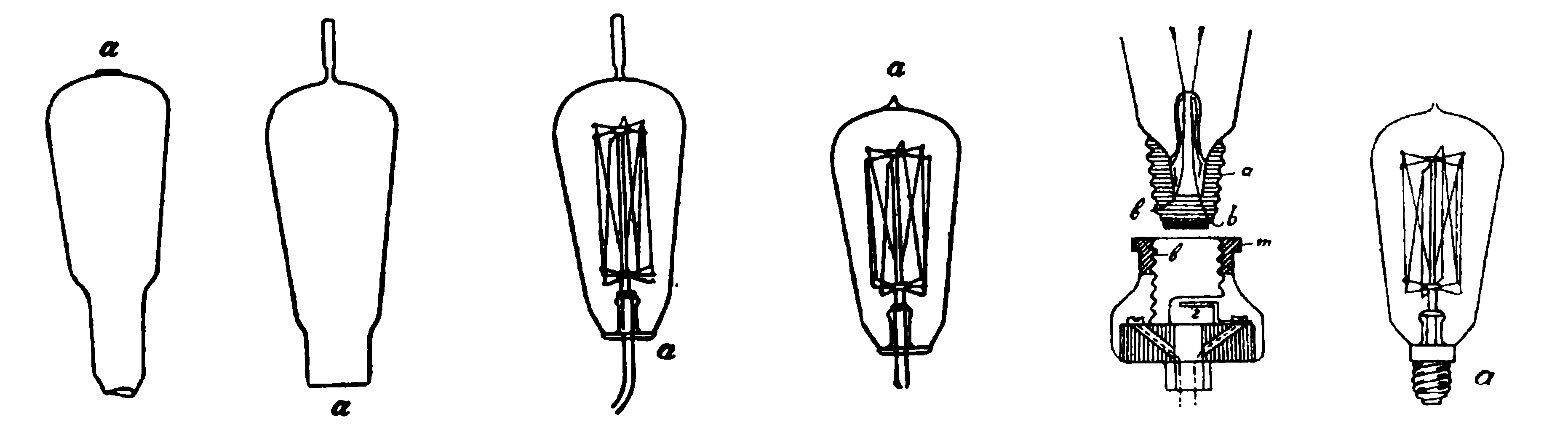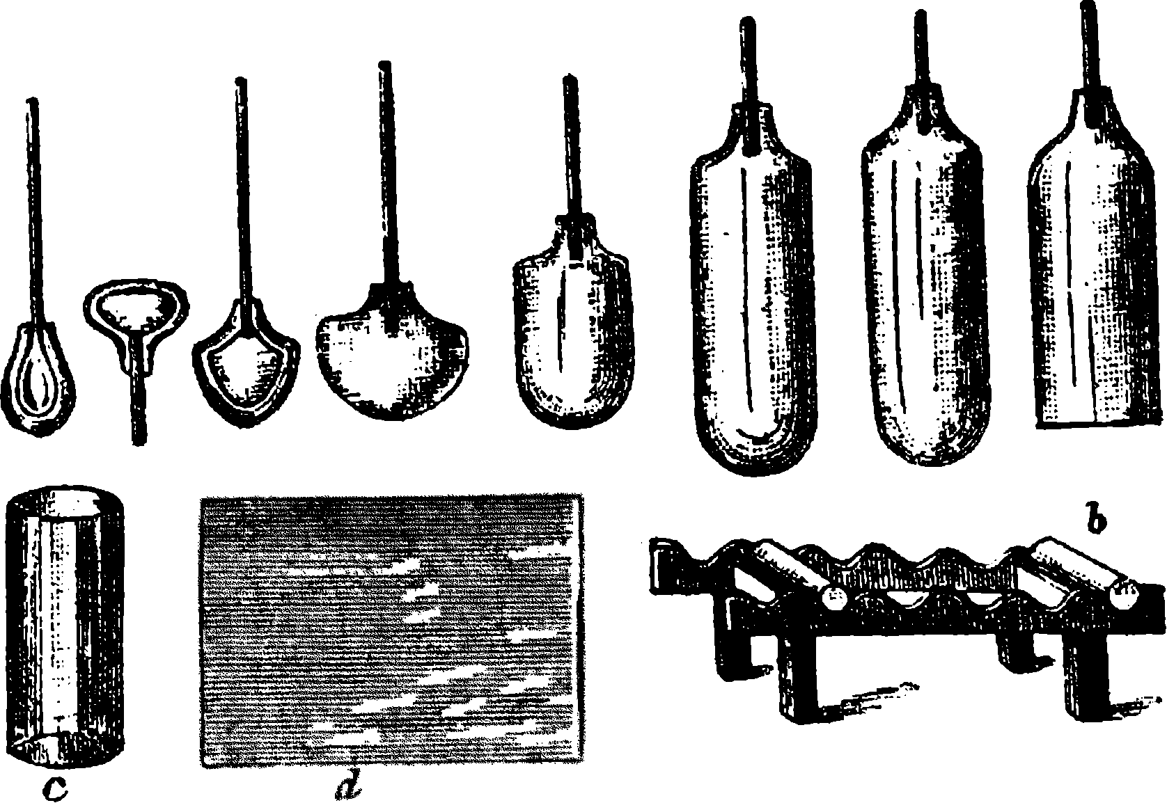 Сперва делается внутренняя часть лампочки. Берется определенной длины и, толщины стеклянная трубочка (рисунок 161), у одного конца которой делается раструб (рис, 162). Затем в нее вставляют со стороны раструба две медных проволочки, в середину которых впаян кусочек из особого сплава (так называемого „платинита“) никеля и железа, показанный на рисунке 163 буквой b, и припаивают на огне как раз этим местом проволочки к трубке, которую тут же сплющивают; тем самым проволочки совершенно закрепляются в стекла (рисунок 164 а, б, в, г).