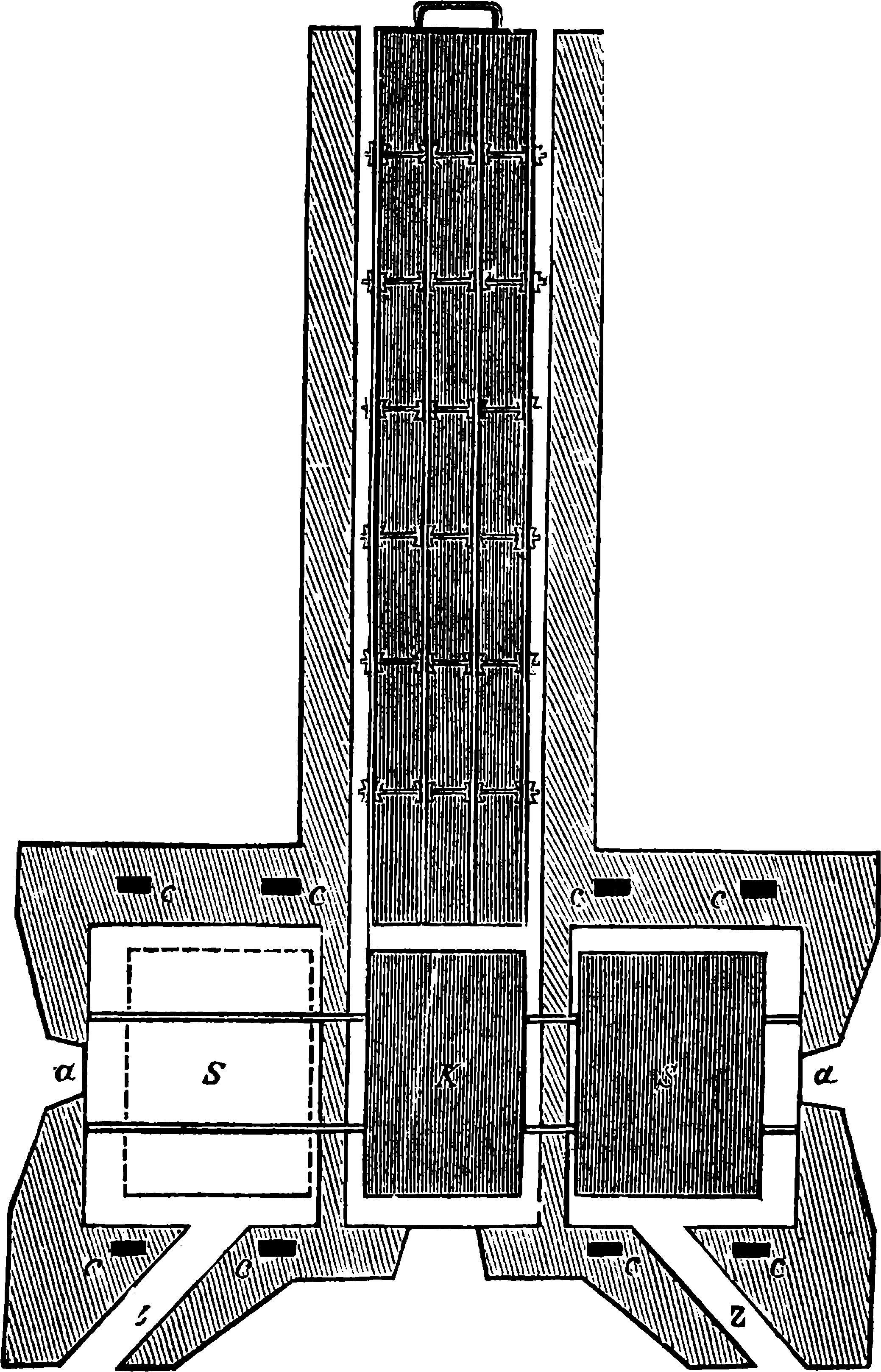 Основная мысль газового отопления заключается в том, что твердое топливо не сжигается непосредственно, а путем разложения в особых аппаратах, называемых генераторами, превращается в горючие газы. И только уже эти генераторные газы подводятся по каналам к пламенному пространству стеклоплавильной печи, при поступлении в которое они смешиваются с воздухом и сгорают, давая чистое пламя и высокий жар. При газовом отоплении можно уже пользоваться не только дорогим, но и малоценным и дешевым топливом. Но этим не ограничились усовершенствования Сименса. Он использовал тепло, которое в больших количествах уносилось в трубу вместе с горячими, имеющими температуру 700—800°, уходящими из пламенного пространства газами (дымом), для подогрева холодного воздуха и генераторного горючего газа до поступления их и смешения в пламенном пространстве. Эту мысль он осуществил путем постройки так называемых регенераторов. Регенераторы представляют из себя большие квадратные камеры, сложенные из огнеупорного кирпича.