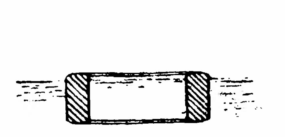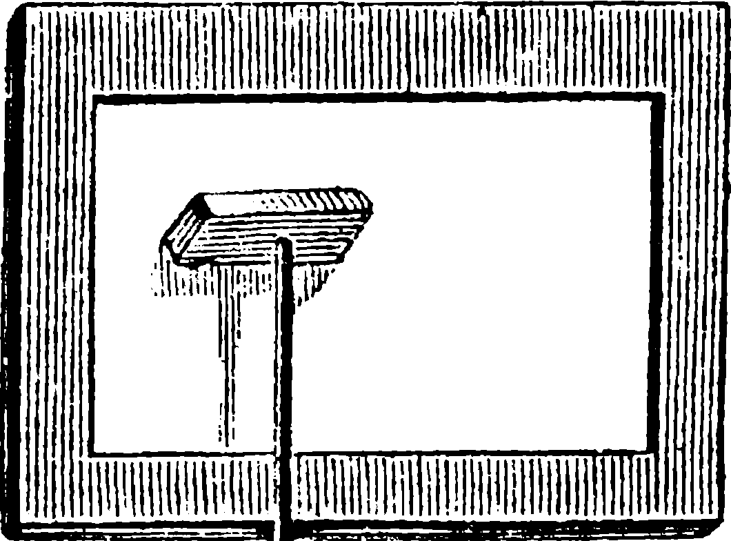 Рисунок 144. Фуляза. ком (рисунок 142) из окна печи, несколько остужают его и, продолжая вращать, слабым вдуванием через сосок образуют так называемую баночку (рисунок 143), то есть слегка раздутый, но все еще очень небольшой правильной формы ком с толстыми стенками и маленькой пустотой внутри. Эта баночка является вообще первоначальной формой для любого изделия из полого стекла. При выдувании баночки, для того, чтобы возможно ближе придвинуть к концу трубки набранный ком, мастер (баночник) пользуется особой рогулькой, так называемый фулязкой, обычно прикрепленной над корытом с водой, служащей для охлаждения трубки (рисунок 144). Самую баночку он выдувает непрерывно, катая набранный ком в так называемом дол оке, то есть деревянной чурке с углублением соответствующей формы (рисунок 145 и 146); тем самым он сглаживает наружные стенки кома и придает ему правильную нужную форму.