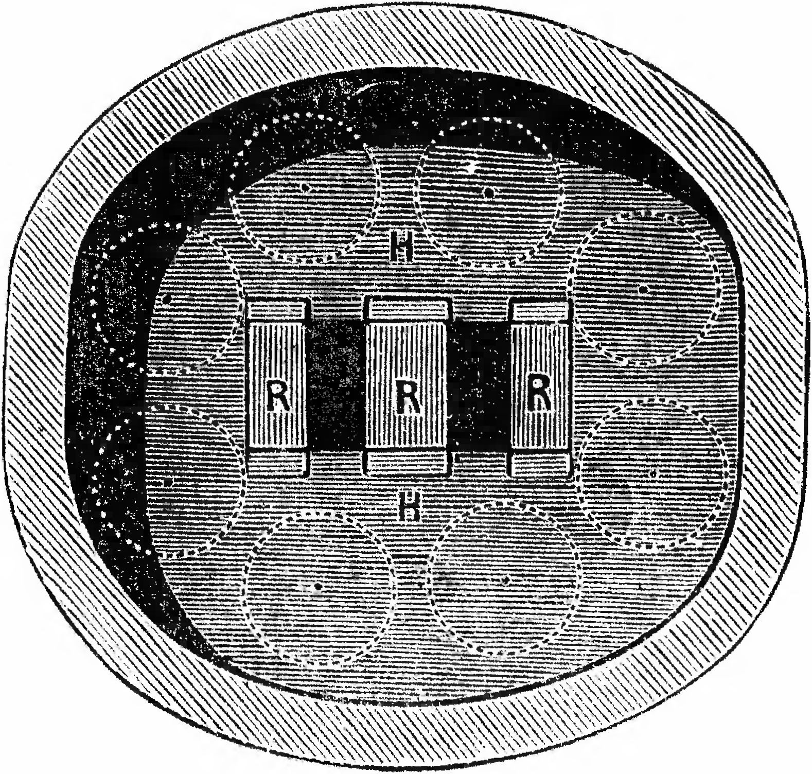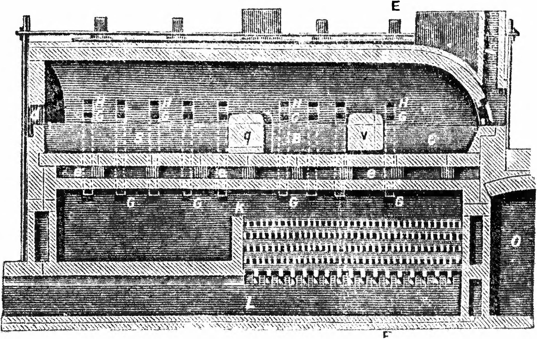 На поду Н ставятся 8 горшков; каждый горшок дает в течение суток 3 тонны стекла; дрова горят на решотках из огнеупорных камней R, причем зола проваливается в зольник А, из которого поступает нужный для горения свежий воздух; дрова требовались очень сухие и смолистые и расходовались в большом количестве.