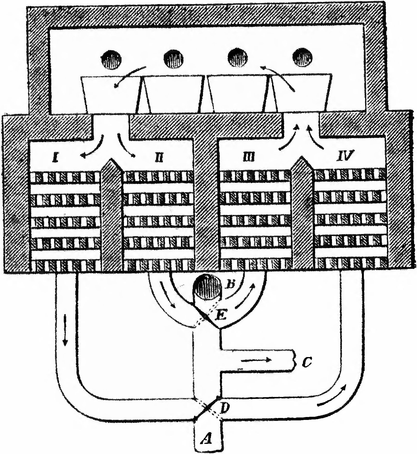Рисунок 137. Схема устройства регенераторов и соединения их с печью.