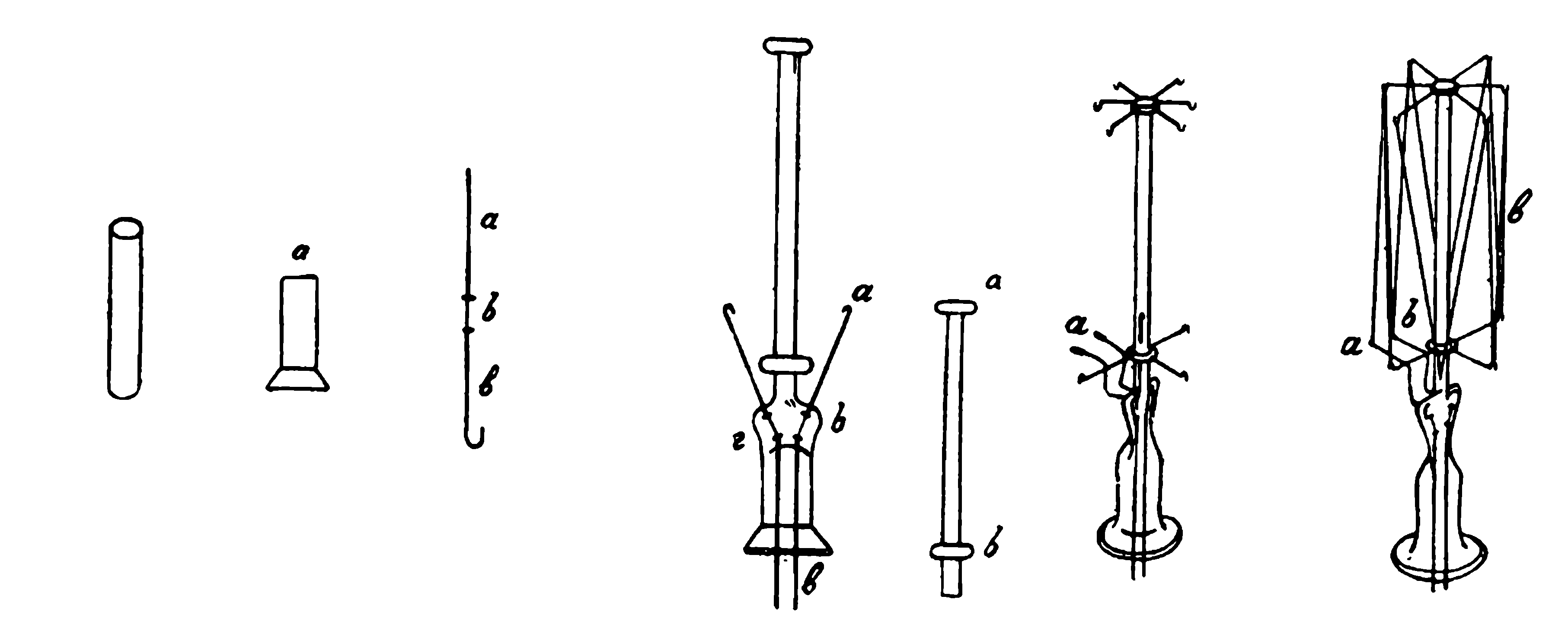 Затем к верхней части сплющенной трубки напаивают стеклянную палочку с двумя поясками у концов (рисунок 165 а, б). В эти пояски впаивают тонкие крючки, внизу медные, а вверху — из металла„молибдена“ (рисунок 166), между которыми натягивается тонкая нить из какого-либо указанного ранее металла или сплава (чаще всего вольфрама и осмия) так, как это показано на рисунке 167. Концы маталлической нити прикрепляются к медным проволочкам, впаянным в стеклянную трубку.