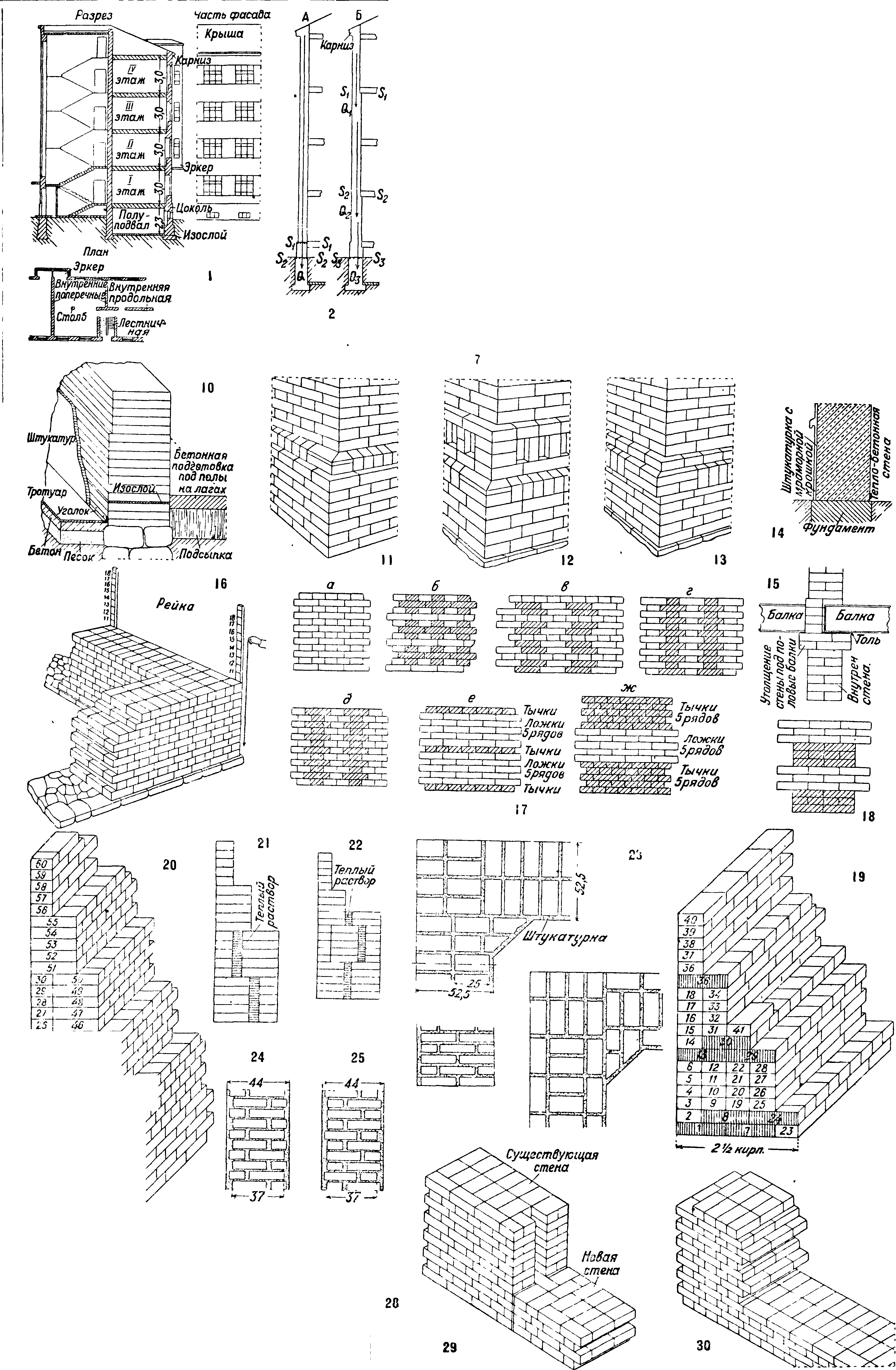Соединение существующих С. с новыми. В тех случаях, когда приходится пристраивать новые С. к существующим старым С., в последних предварительно выбирают (вырубают) вертикальный паз или же он заранее .бывает сделан (фигура 29), когда предвидят будущую пристройку. Новую стену, пристраиваемую к существующей, выкладывают со шпунтом, к-рый входит в выбранный или существующий паз. Подобное соединение не препятствует осадке новой С. Способ соединения С. существующей и новой посредством зубцов или штраб не допускается потому, что подобное плотное соединение двух стен заставит старую несколько осесть вместе с новой, почему могут получиться в здании хотя и неопасные, но все же нежелательные трещины над окнами или дверями, расположенными вблизи места соеди нения С. Штрабы (фигура 30) устраивают (вернее, оставляют) тогда, когда по каким-либо причинам кладку в какой-либо части стены приходится временно прервать. Благодаря оставленным таким штрабам дальнейшая кладка стены будет прочно связываться с выведенною раньше кладкою.