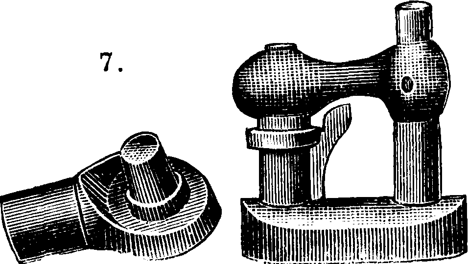 Для изготовления круглых и призматич. стержней применяют машины, аналогичные машинам, применяемым в колбасном производстве. Гораздо более совершенным представляется способ приготовления стержней посредством вдувания стержневой массы в соответствующий стержневой ящик; этим способом можно готовить стержни самых разнообразных очертаний (фигура 7). Способ работы заключается в следующем; на столе машины (фигура