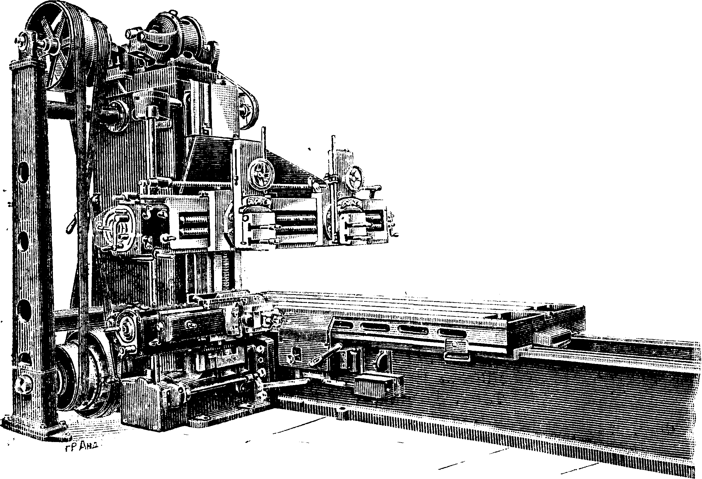 По бокам ямы имеются направляющие, но которым передвигаются стойки с поперечиной. На поперечине установлены четыре супорта, из которых 2 работают при одном направлении движения^ 2—при обратном. Однако станок может работать и в одном направлении, т. к. имеет быстрый обратный ход. Перемена направления движения стоек производится от реверсивного электромотора. С. с. для котельных листов строятся с длиною строгания 3—15 метров и высотою зажима 150—400 миллиметров, мощностью 18— 30 ЬР. Большие станки имеют зажим листов не ручной, как указано на фигуре 21а, а гидравлический (давление 100 aim) или от отдельного электромотора. Ямные строгальные станки строятся рабочей шириной до 4,5 метров и длиной до 10 метров.