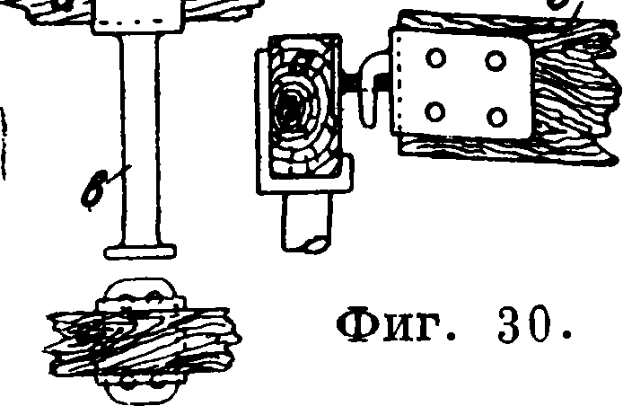 5) Судоподъемные винты. Способ С. винтами виден на фигуре 4. Две баржи (или понтона) ά связаны между собой в жесткую систему при помощи балок б; вращением гаек в поднимают Винты, соединенные с цепями, подведенными под судно. Вместо барж при небольшой глубине затонлейия м. б. забиты с обоих бортов судйа свай г, на которые и опирают балки б. После исчерпания всей длины нарезки винтов цепи подхватываются на стопоры, винты спускаются вниз и Скобы их захватываются за ближайшие