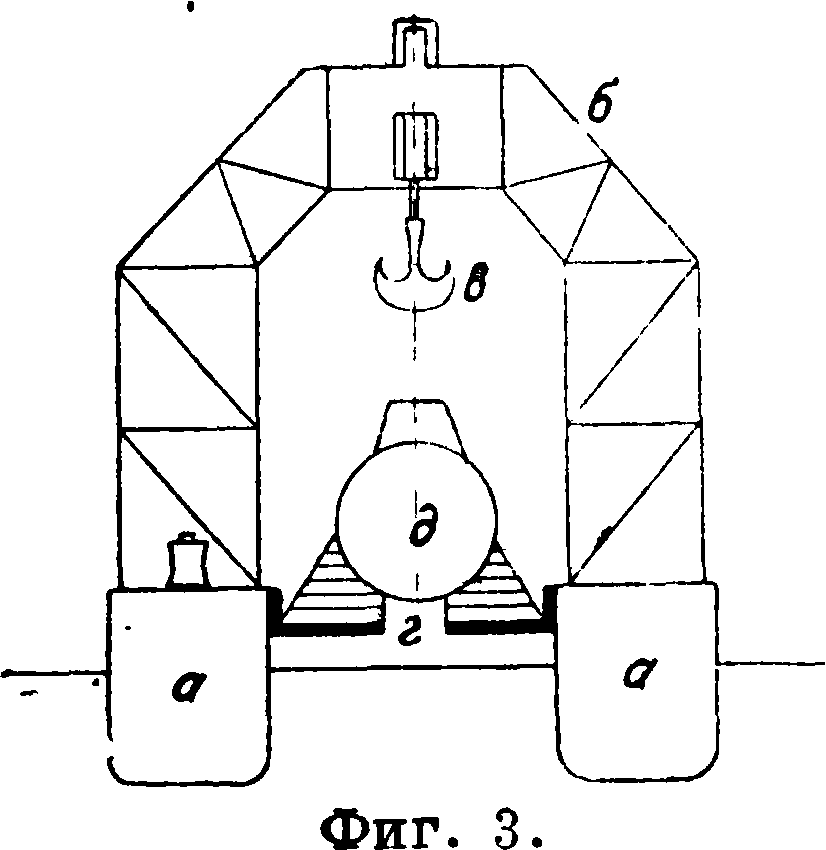 (фигура 3). Они состоят из двух судов а, связанных между собой в носу и корме надстройками, а в середине четырьмя аркамй б, снабженными каждая гинями в; поднятая с грунта или из воды лодка д (до 1 000 ш весом) устанавливается на поворотные балкй г, при подъеме лежащие плотно прижатыми к бортам. Длина тросов гиней «Коммуны» позволяет произвести подъем с глубины до 55 метров Время подъема гинями, после подхвата лодки, 2 часа. При помощи «Коммуны» в 1927 г. экспедицией подводных работ поднята с глубины свыше 30 метров англ, подводная лодка L-55 подъемным весом в 1 000 т.