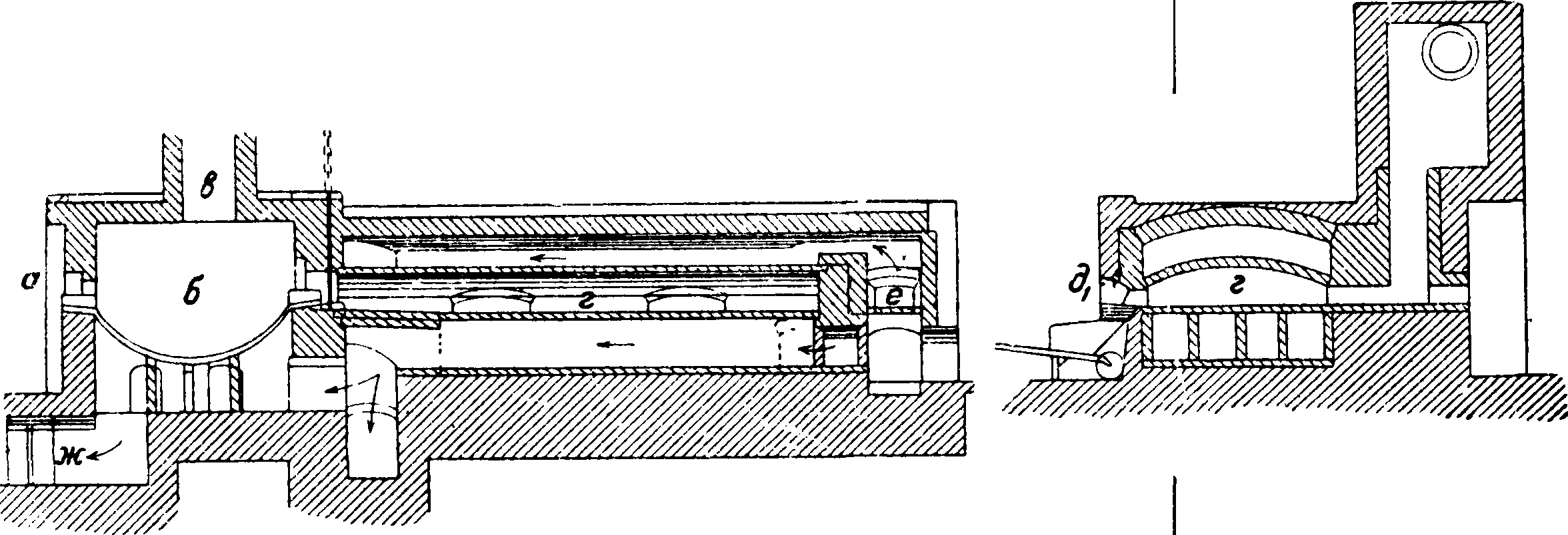 Механические сульфатные печи вошли в практику с 1896 г. На фигуре 2а и 26 показана механич. сульфатная печь Маннгеймского завода [2]. Печь эта состоит из чугунного муфеля а (диам. 5 м), внутри которого поставлена на вертикальной оси б мешалка в с кулаками г.Материал загружают через воронку ό, откуда он при посредстве шне- * ка подается в трубу вив муфель а. Выделяющийся при реакции НС1 отводится по трубе ж. Готовый С. при t° 450° выгружается по воронке з в поставленные тут же вагонетки. Весь муфель неподвижен, т. к. вделан в кирпичную кладку; топочные газы из топки и обогревают