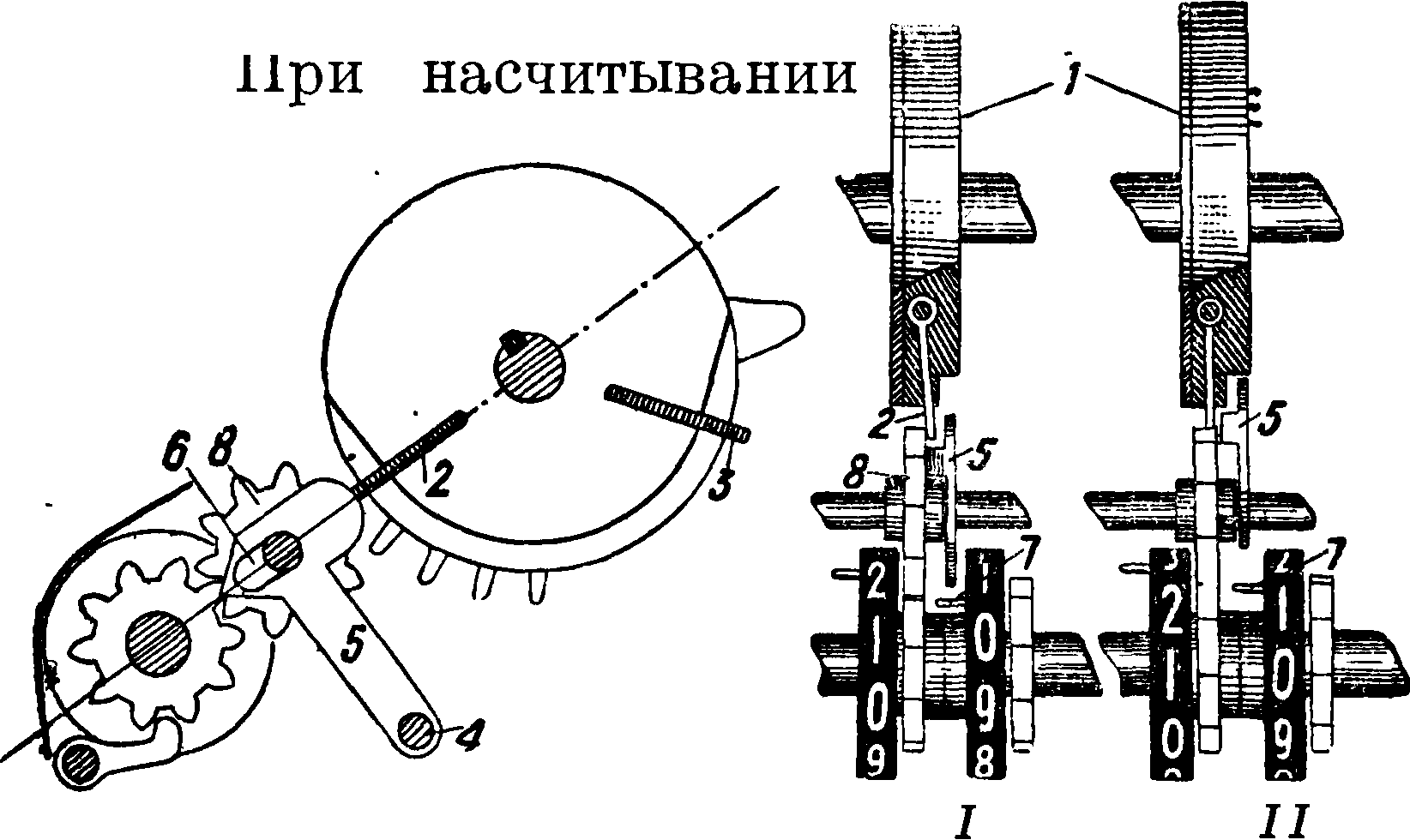 Механизм для передачи десятков схематически показан на фигуре 33. В однеровскую зубчатку 1 вставлены два пальца 2 и 3. Около неподвижной оси 4 качается молоточек 5 в пределах, ограниченных пазом 6. Когда цифровое колесо счетчика низшего разряда сделало полный оборот, то при переходе его с 9 на 0 штифт 7 отодвигает молоточек 5 во II положение. Палец 2 высшего разряда, проходя мимо выступающей части молоточка, отклонится влево (положение II) и, придя в зацепление с промежуточной зубчаткой 8, передвинет ее на один