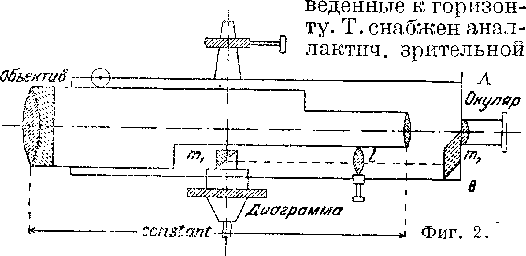 роне горизонтальной оси трубы. Одна кривая наводится на нуль рейки, а по двум другим отсчитывают непосредственно искомое горизонтальное расстояние и превышение. Изображение этой диаграммы (фигура 2) получается в левой части поля зрения трубы с помощью двух призм, из которых трехгранная призма тг расположена против диаграммы с кривыми, другая же, четырехгранная, призма т2 находится вблизи окуляра. Одна из граней призмы т2 совпадает с фокальной плоскостью объектива трубы, а ребро ее заменяет вертикальную нить и всегда наводится на левый край изображения рейки. Лучи света, пройдя диаграмму, падают на призму тг и, отразившись от нее под прямым углом, идут к двояковыпуклой линзе I, которая эти лучи собирает; затем они попадают на призму т2, где, отразившись дважды, дают изображение соответствующей части диаграммы в плоскости АВ. При вращении трубы в вертикальной плоскости изображение .диаграммы перемещается в поле зрения трубы. Вертикальный круг отсутствует. Построение диаграммы вытекает из 4 основных ф-л, даваемых теорией Т. Феннеля: