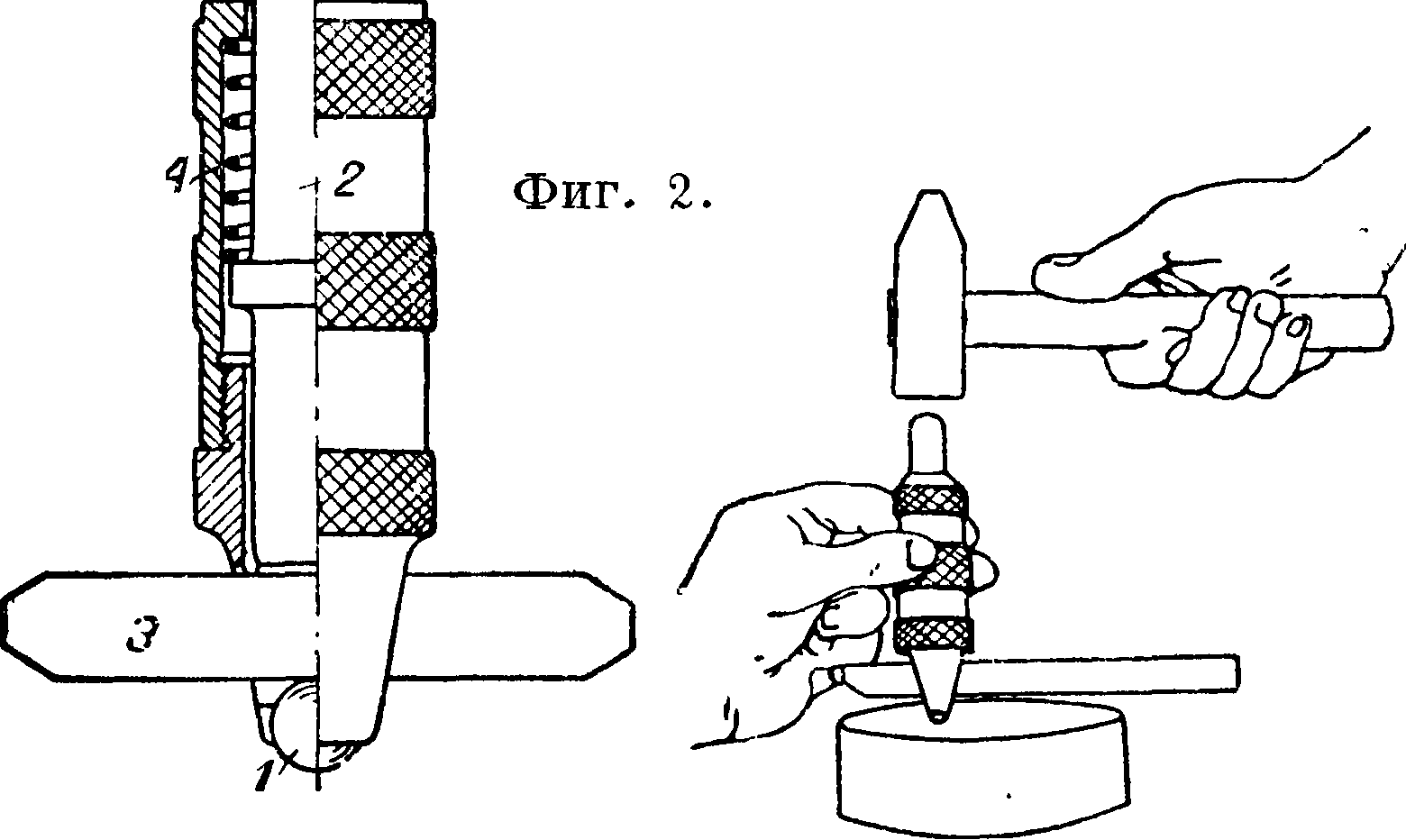 Прибор Польди. Наиболее распространенным в СССР простым прибором для определения Т. по Бринелю является аппарат Польди, к-рый настолько портативен, что удобно * помещается в кармане. Испытание на нем производится при помощи шарика 1 (фигура 2); диам. шарика 10 миллиметров. Аппарат ставится на испытуемую поверхность этим шариком; поверхность предварительно должен быть зачищена напильником или наждачным кругом. Затем по верхней выступающей части шпинделя 2 производят сильный удар молотком; удар должен быть по возможности строго центральным. Шарик 1 производит отпечаток на испытуемом материале и кроме того на призматич. бруске 3, к-рый вкладывается между шариком и нижним кон-