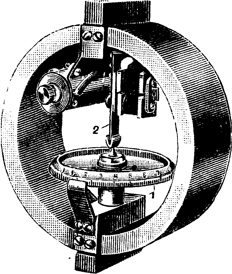 МонотронШора (фигура 4) измеряет Т, проникновения. При испытании им в материал вдавливается алмаз со сферич. концом, диаметр закругления его равен δ/β мм· Глубина проникновения измеряется индикатором. Прибор также измеряет и нагрузку, приложенную к сфере; приложение нагрузки производится руч ным рычагом. Монотрон может измерять Т. по измерению глубины проникновения при постоянной нагрузке, а равно и Т. по измерении * нагрузки, необходимой для проникновения алмаза на постоянную глубину. Это прибор новый и большого распространения в лабораториях СССР пока еще не получил.