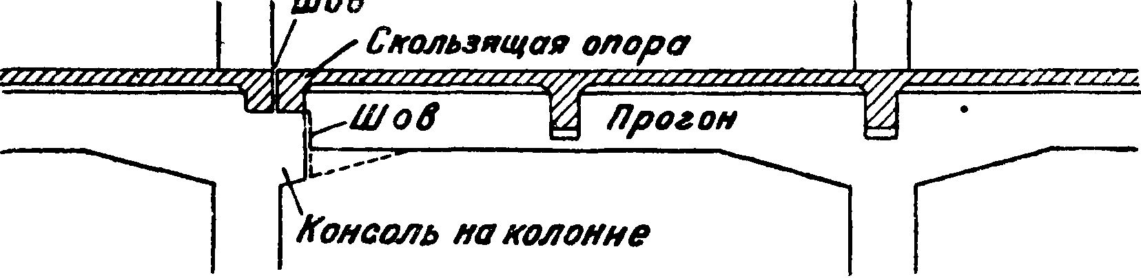 Конструкция Т. ш. должна обеспечивать свободную деформацию частей сооружения. В деталях Т. ш. представляют большое разнообразие. В частности применяется устройство спаренных колонн на общем фундаменте, свободное опирание концов балок на консоли других и прочие Чаще всего швы делают вблизи стоек. Опирание балок на консоли должно происходить так, чтобы подвижность не нарушалась ни при каких обстоятельствах. Для этого рекомендуются прокладки из свинца или специального картона или по меньшей мере гладкая затирка поверхностей. Необходимо, чтобы швы в плитах и балках располагались в