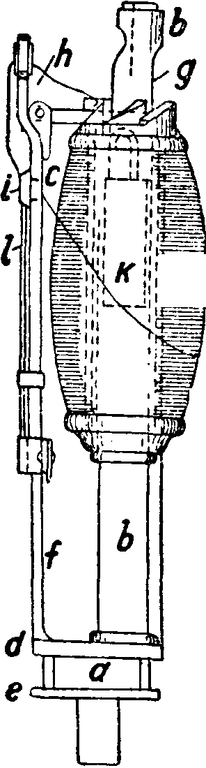 лы“ других окружностей, совершая таким образом "путь в" виде законченной петли. Для остановок отдельных коклюшек, в случае обрыва нити, в верхней части шпули имеются храповые зубья д, находящиеся под рычагом h. В случае обрыва нити гиря 1с падает вниз и перестает действовать на рычаг h, к-рый при этом падает и, попадая в промежутки между зубьями д, останавливает шпулю. Когда оборванная нить связана, то она своим натяжением вновь поднимает гирю, которая в свою очередь поднимает рычаг h, и ш т вновь получает свое прежнее вращение (смотрите Ткани, плетеные изделия).